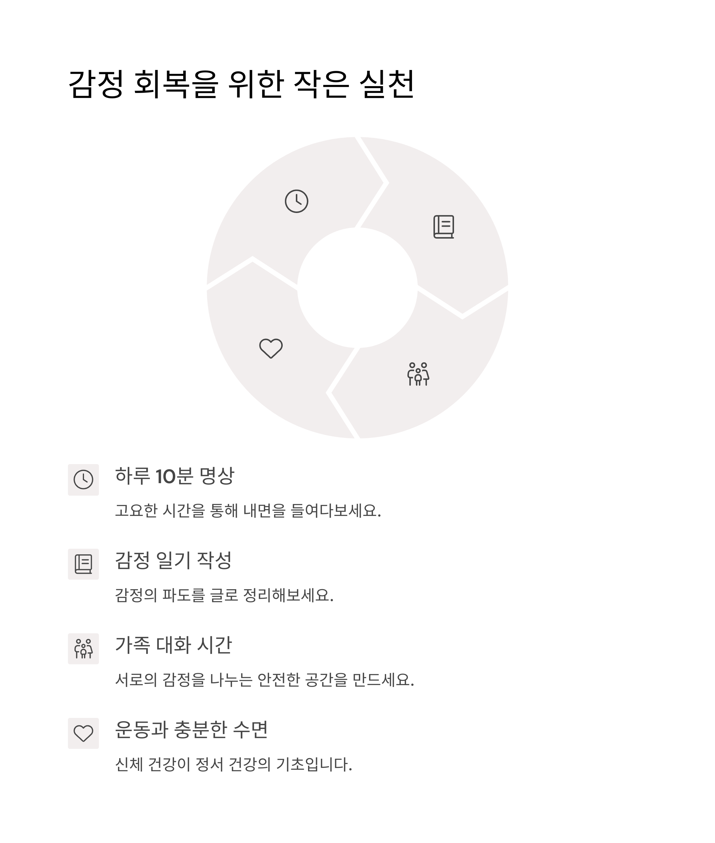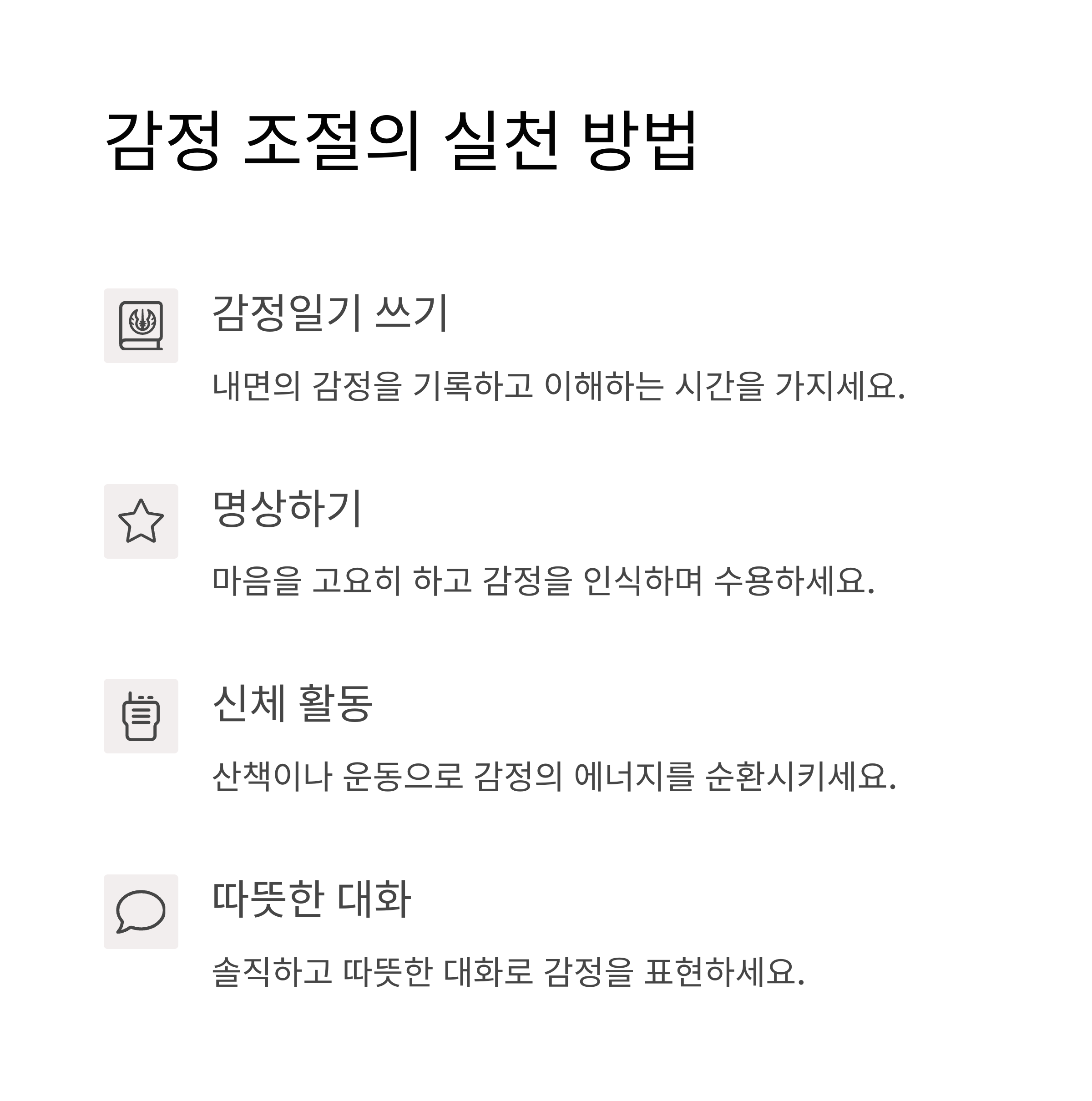| 감정일기, 호흡, 산책으로 감정 정리하기 | 아이에게도 감정 표현하는 법 가르치기 | 아이와 함께 감정 조절 연습하기 |