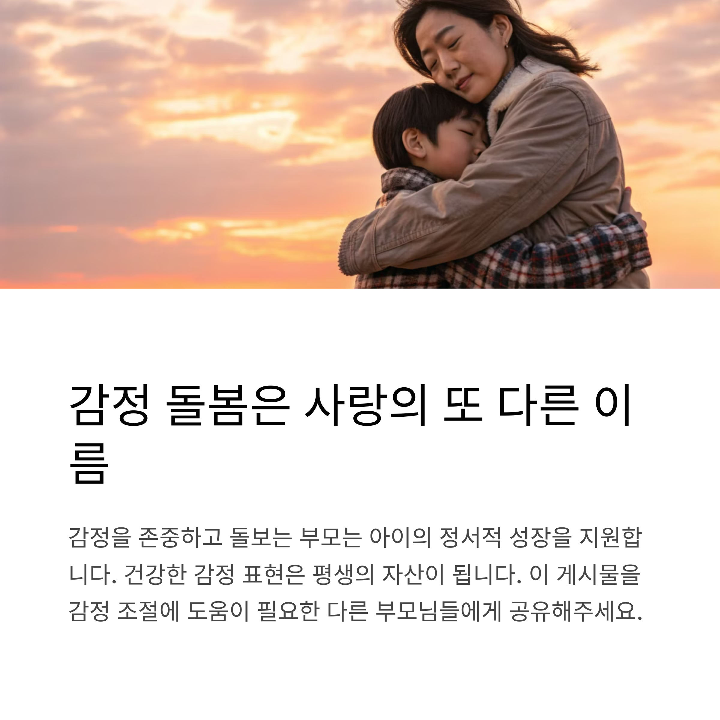 감정 조절은 타고나는 능력이 아닌, 훈련으로 성장하는 기술입니다. 부모가 자신의 감정을 인정하고 솔직하게 표현할 수 있을 때, 아이도 감정을 건강하게 다루는 법을 배우게 됩니다. 매일 반복되는 일상 속에서 내 마음을 돌보고, 아이와 함께 대화를 나누며 서로의 감정을 이해해 나가는 과정은 가족 모두의 성장을 이끄는 힘이 됩니다. 오늘부터 감정에 솔직한 하루를 살아보세요.