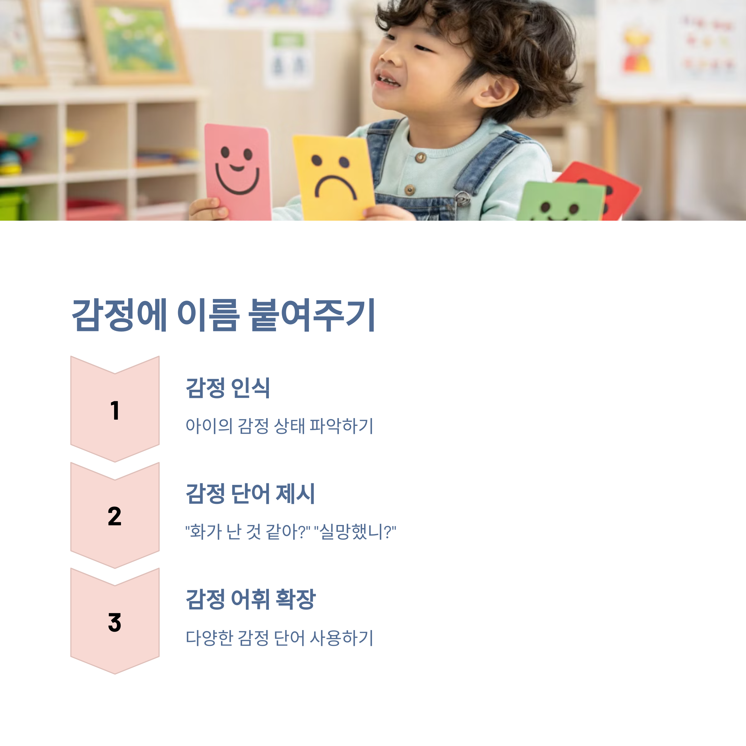 | 감정 이름 붙여주기 | 부드러운 언어와 태도 | 자기 조절력과 공감 능력 강화 |