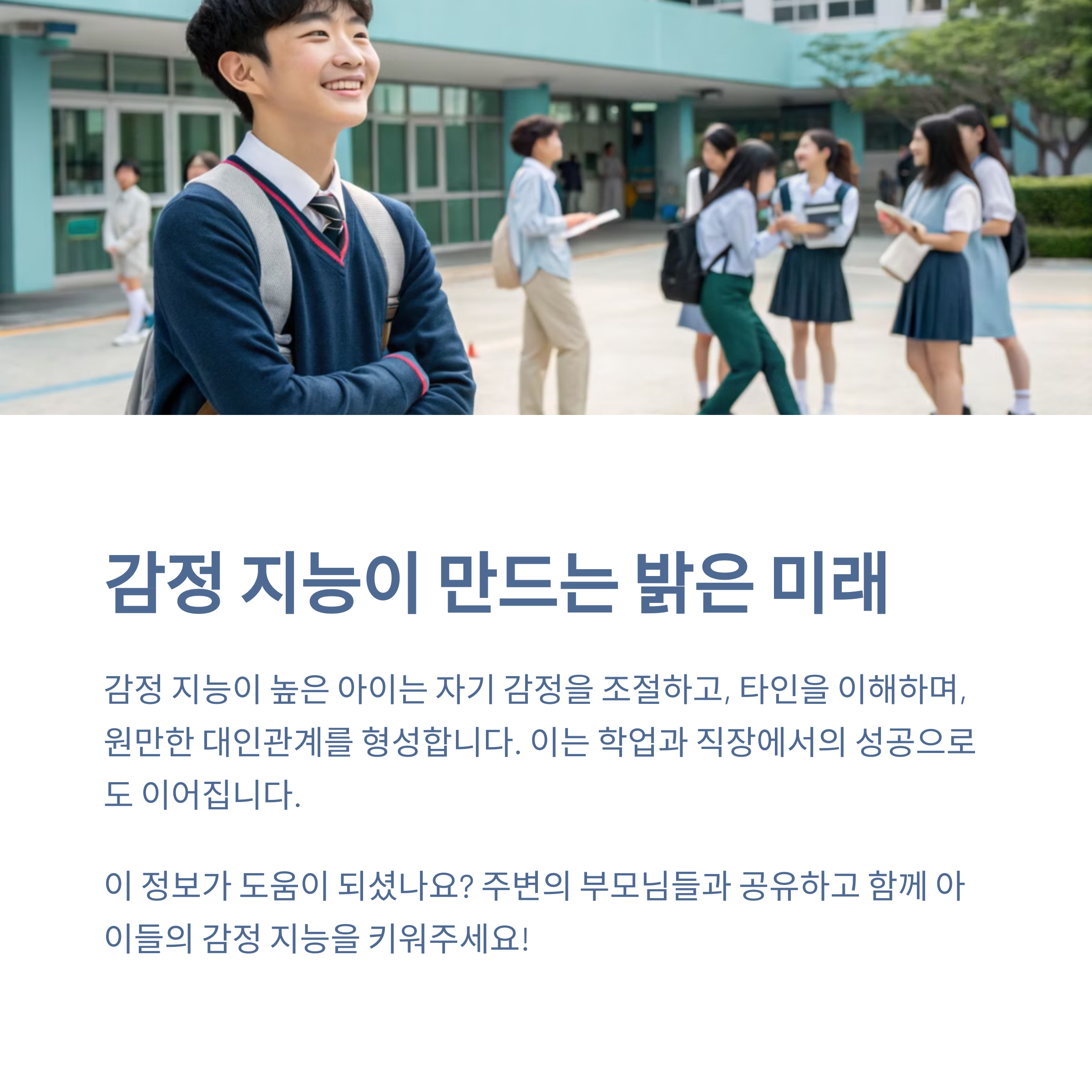 감정 지능은 부모의 대화 속에서 자랍니다. 아이의 말을 끝까지 듣고, 감정을 이름 붙여주는 연습을 해보세요. 감정을 이해받는 경험은 아이를 더 안정되고 사회적으로 성숙하게 성장하게 만듭니다.