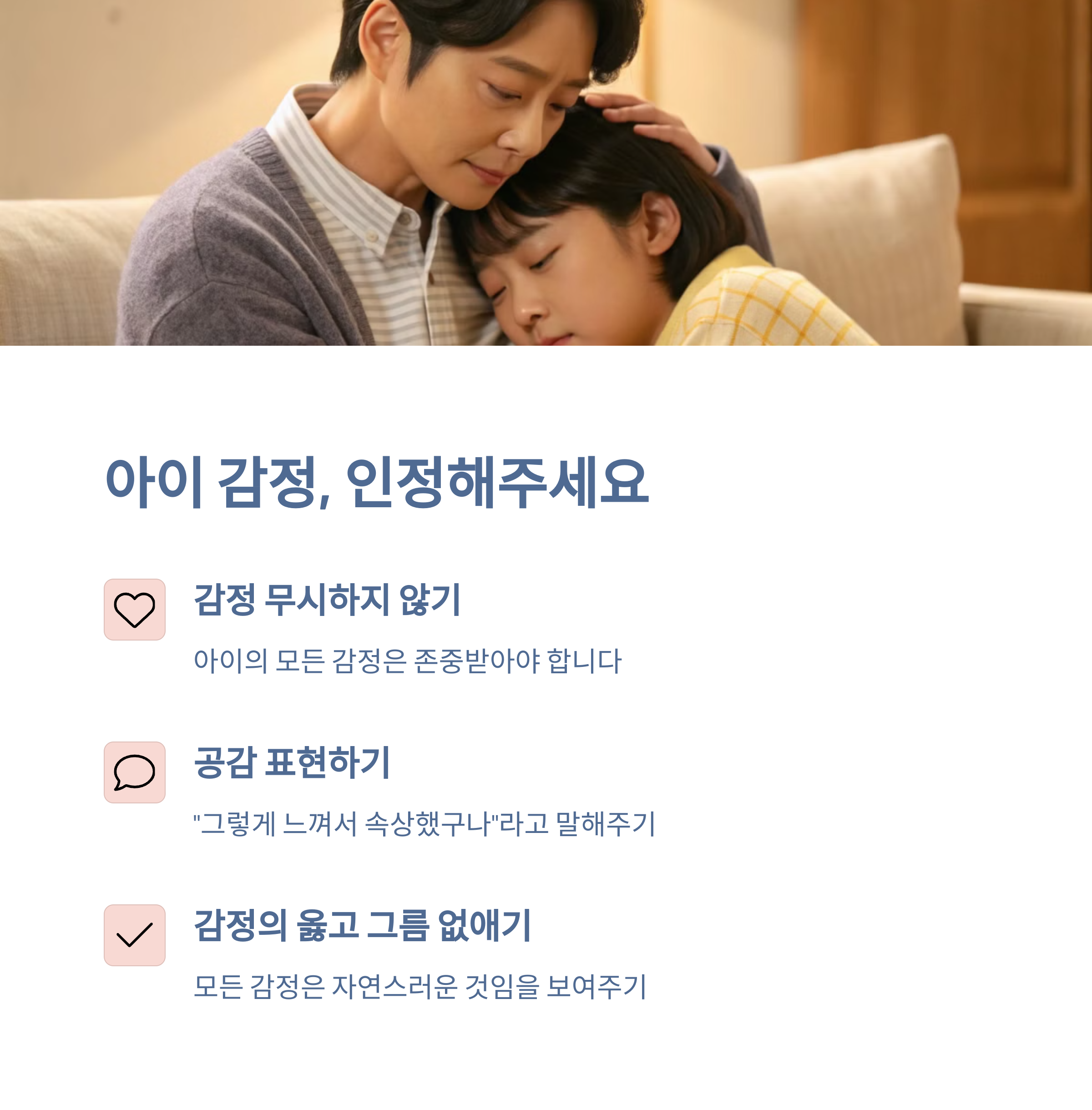 감정을 부정하거나 다그치기보다 아이의 감정을 이해하고 들어주는 자세가 중요합니다. 이후 대안을 제시하거나 감정을 조절하는 방법을 함께 찾는다면, 아이는 감정 다루는 법을 배웁니다. 이는 문제 해결력과 공감 능력까지 길러줍니다.