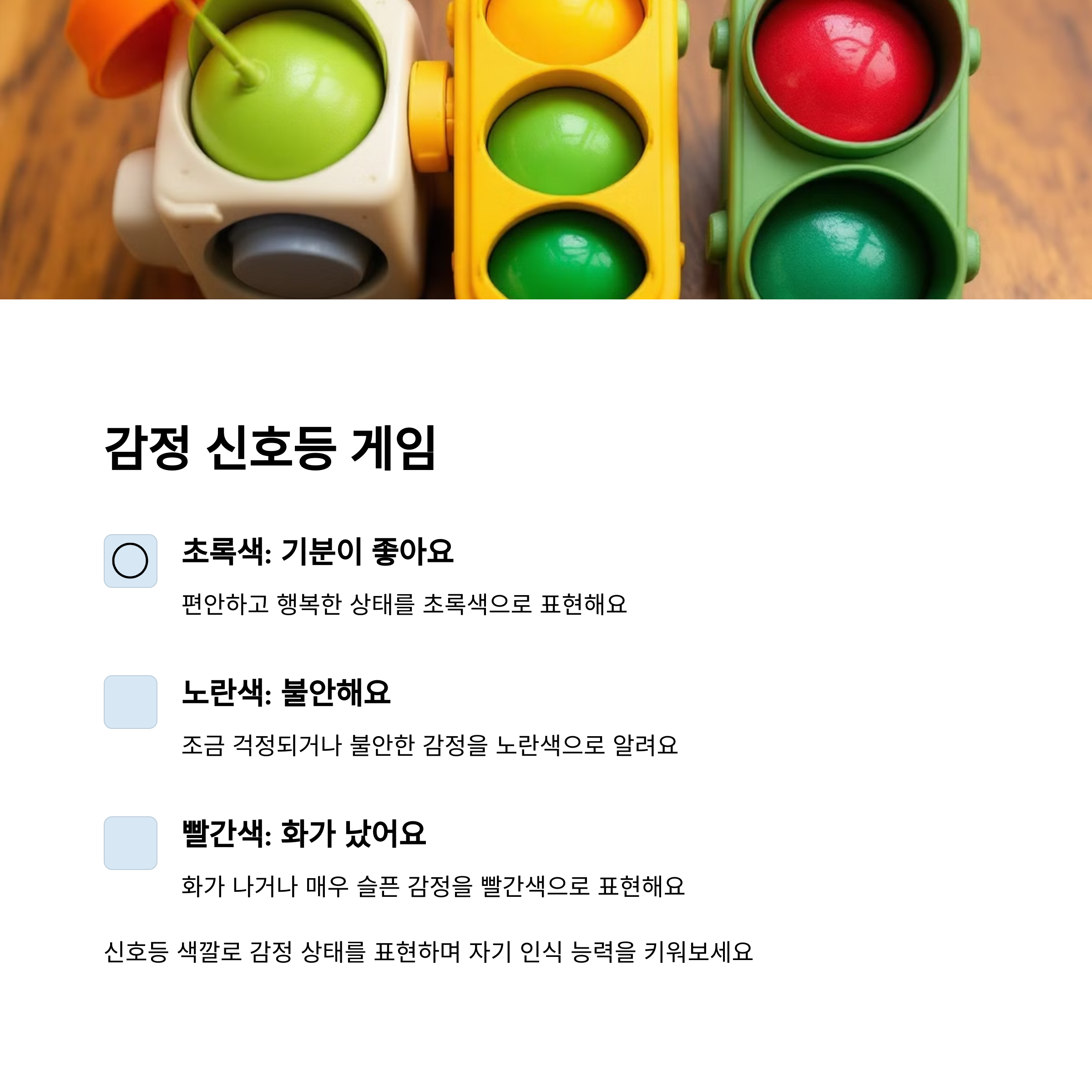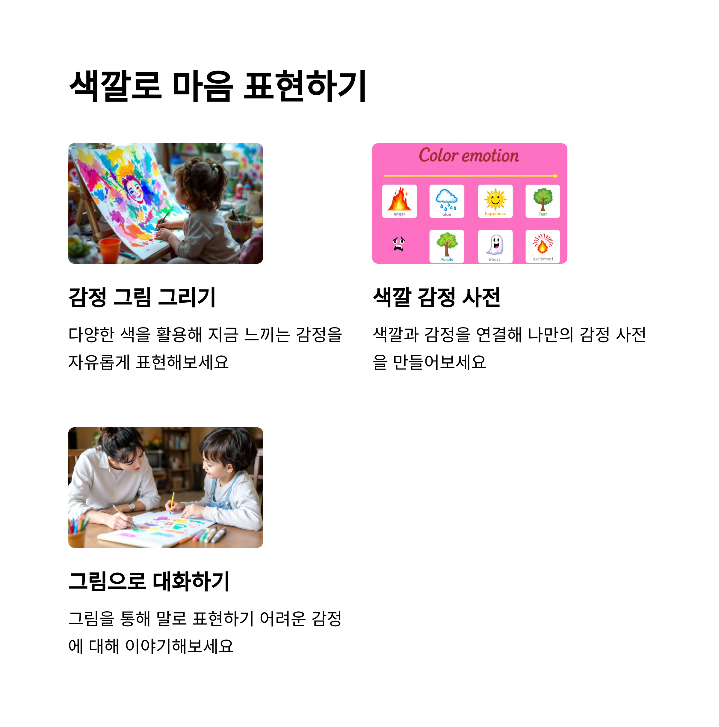 | 표정카드, 감정 스티커, 역할극 활용 | 감정 단어를 배우며 언어적 표현 확장 | 놀이 후 대화로 마음을 확인하고 격려 |