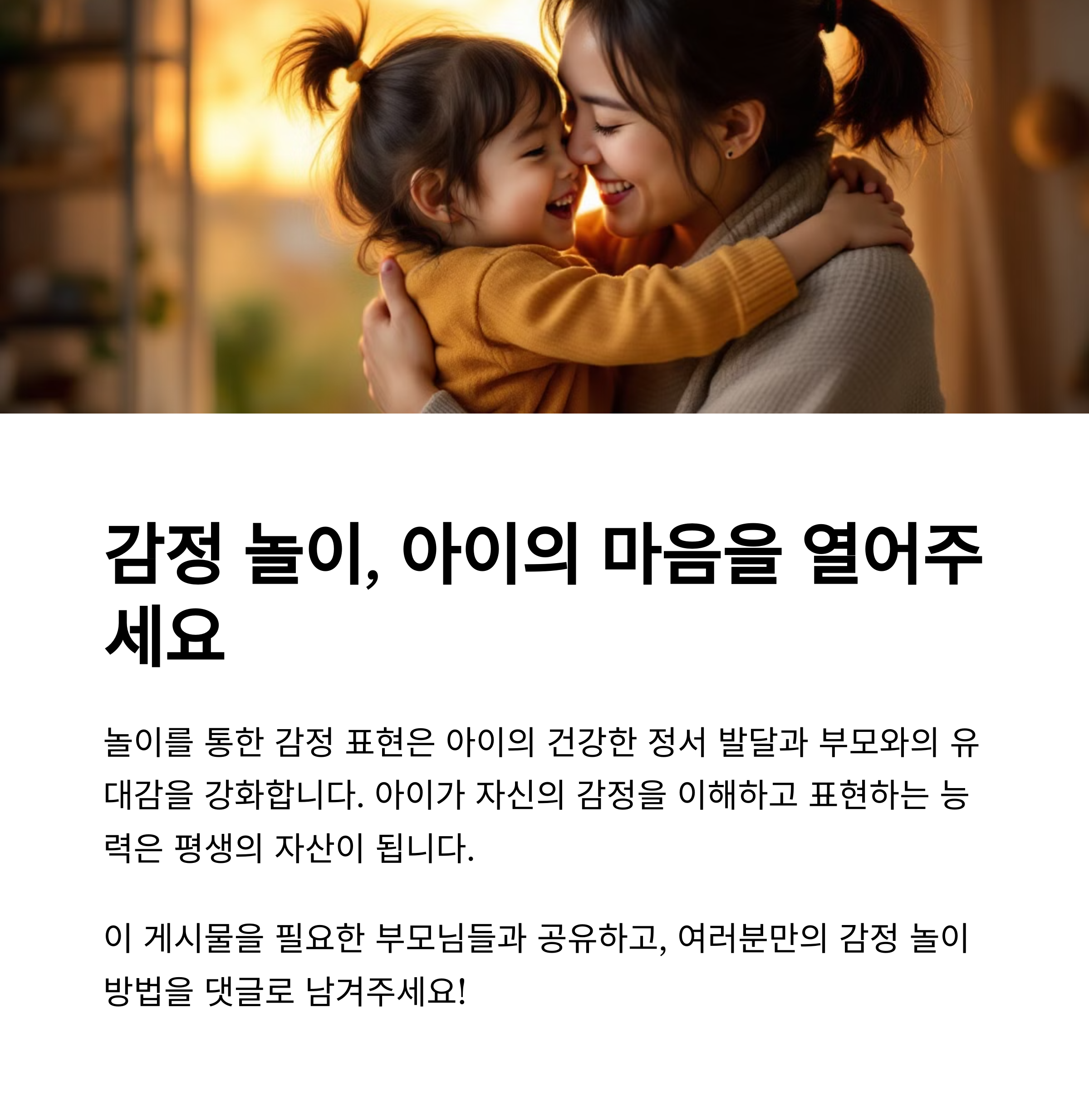 아이가 자신의 감정을 이해하고 표현할 수 있게 도와주는 건 부모의 가장 중요한 역할 중 하나입니다. 감정 표현 놀이는 말로 하기 어려운 마음을 안전하게 꺼내는 방법이자, 부모와 아이의 소통을 더 즐겁고 따뜻하게 만들어주는 다리입니다. 놀이를 통해 감정에 대해 함께 배우고 공감하며, 신뢰와 유대가 자라는 경험을 선물해보세요. 오늘 하루, 아이와 눈을 맞추고 마음을 나누는 시간을 꼭 가져보시길 바랍니다.