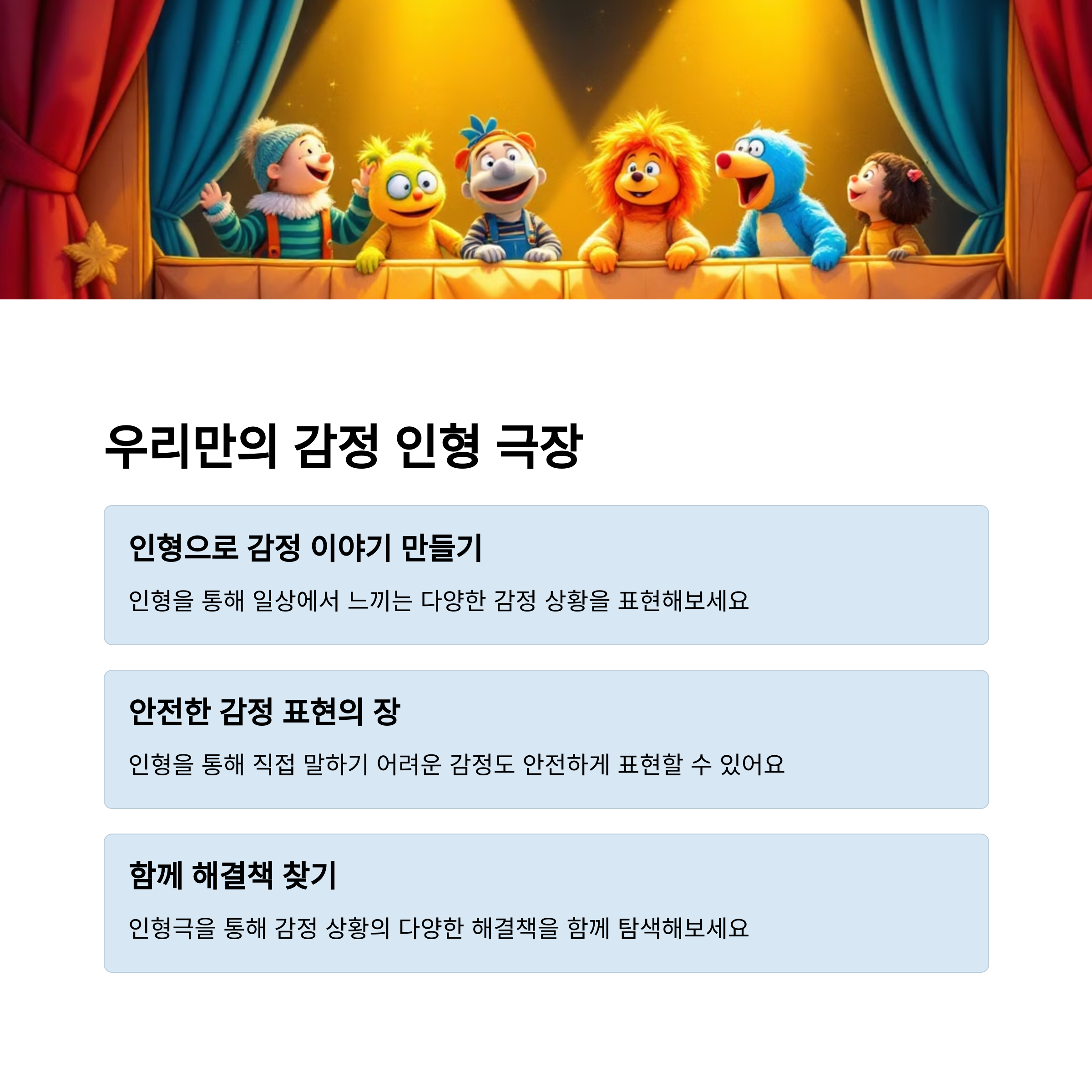 | 놀이를 통해 감정을 말과 행동으로 표현 | 감정을 안전하게 드러내며 마음 정리 | 가족 간 이해와 신뢰를 키우는 시간 |