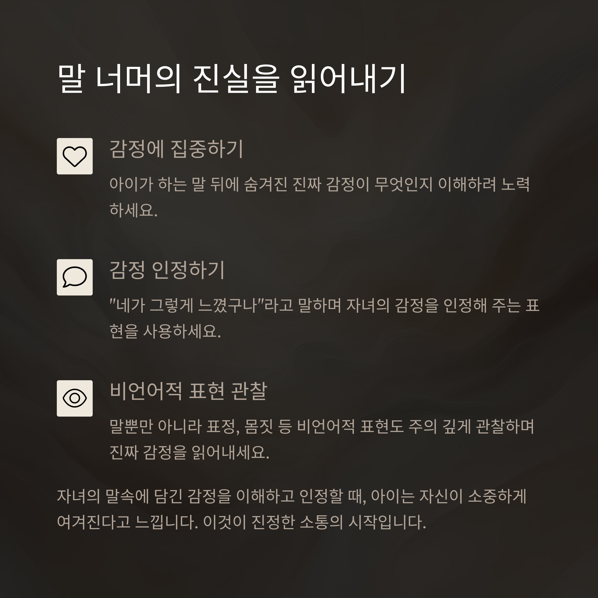 자녀와의 관계를 바꾸고 싶다면 오늘부터 ‘듣기’를 바꿔보세요. 단순히 내용을 듣는 것이 아니라, 감정을 함께 느끼는 것. 그리고 그 감정을 말로 되돌려주는 것입니다. "그랬구나, 힘들었겠다"라는 말 한마디가 자녀의 마음을 열게 합니다. 공감은 작은 표현으로 큰 신뢰를 쌓는 과정입니다.