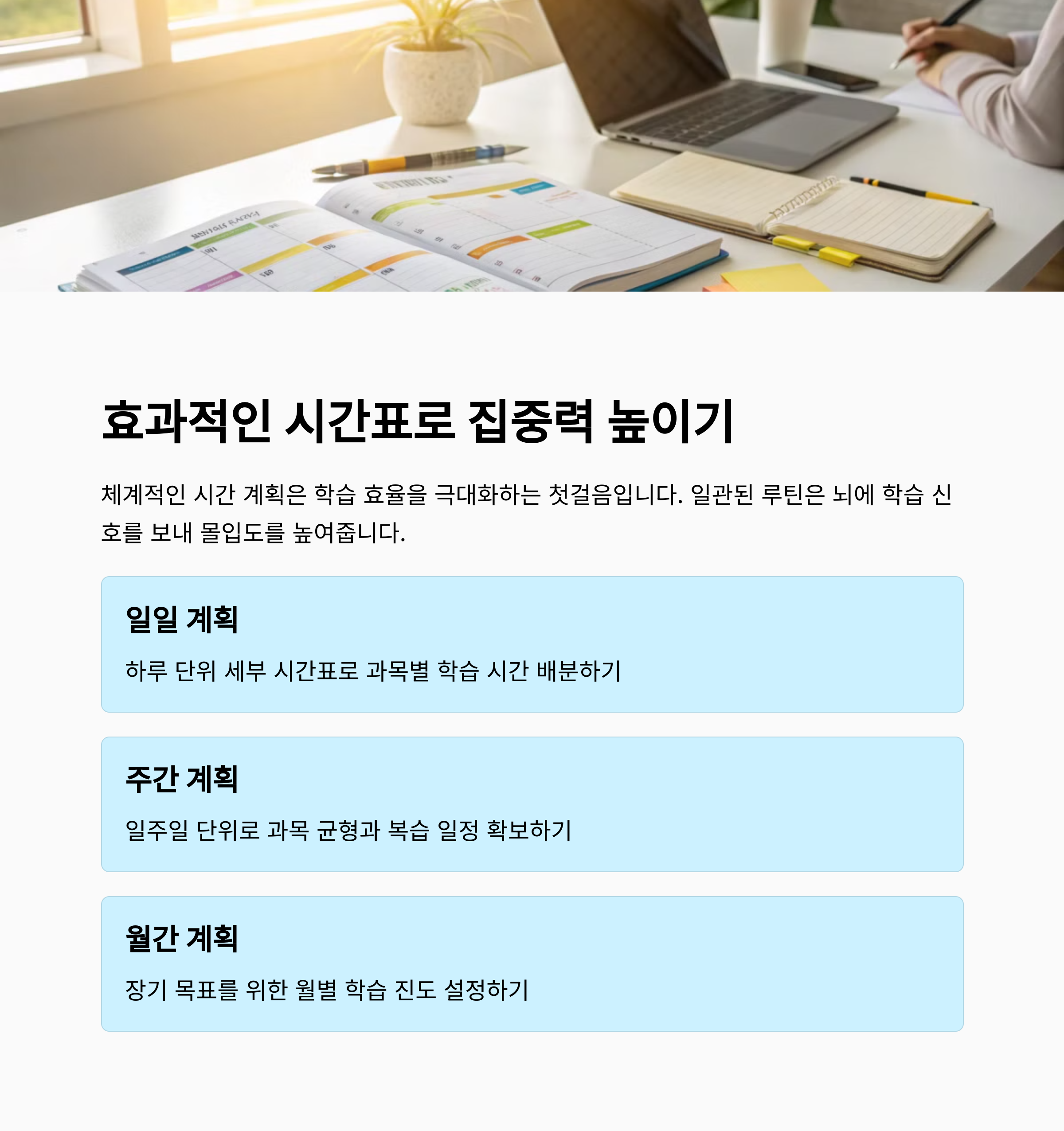 매일 같은 시간대에 일정한 루틴을 유지하고, 목표 기반으로 하루 단위 일정을 작성하세요. 주간 계획과 하루 단위 체크가 함께 병행되면 좋습니다.