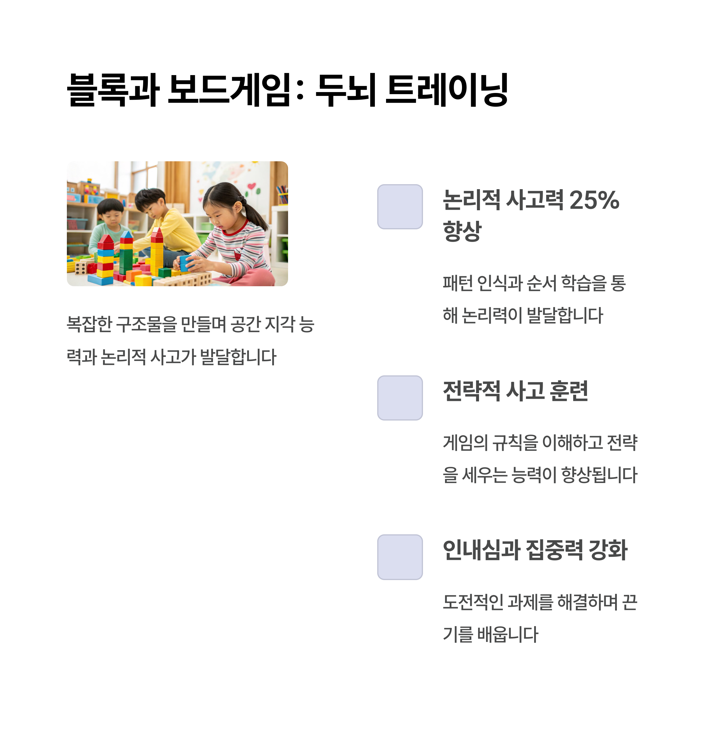 | 숫자 카드, 블록 교구, 실험 키트 활용법 | 상상력 확장 가능한 미술, 만들기 놀이 | 함께하는 놀이가 정서 안정과 몰입 유도 |