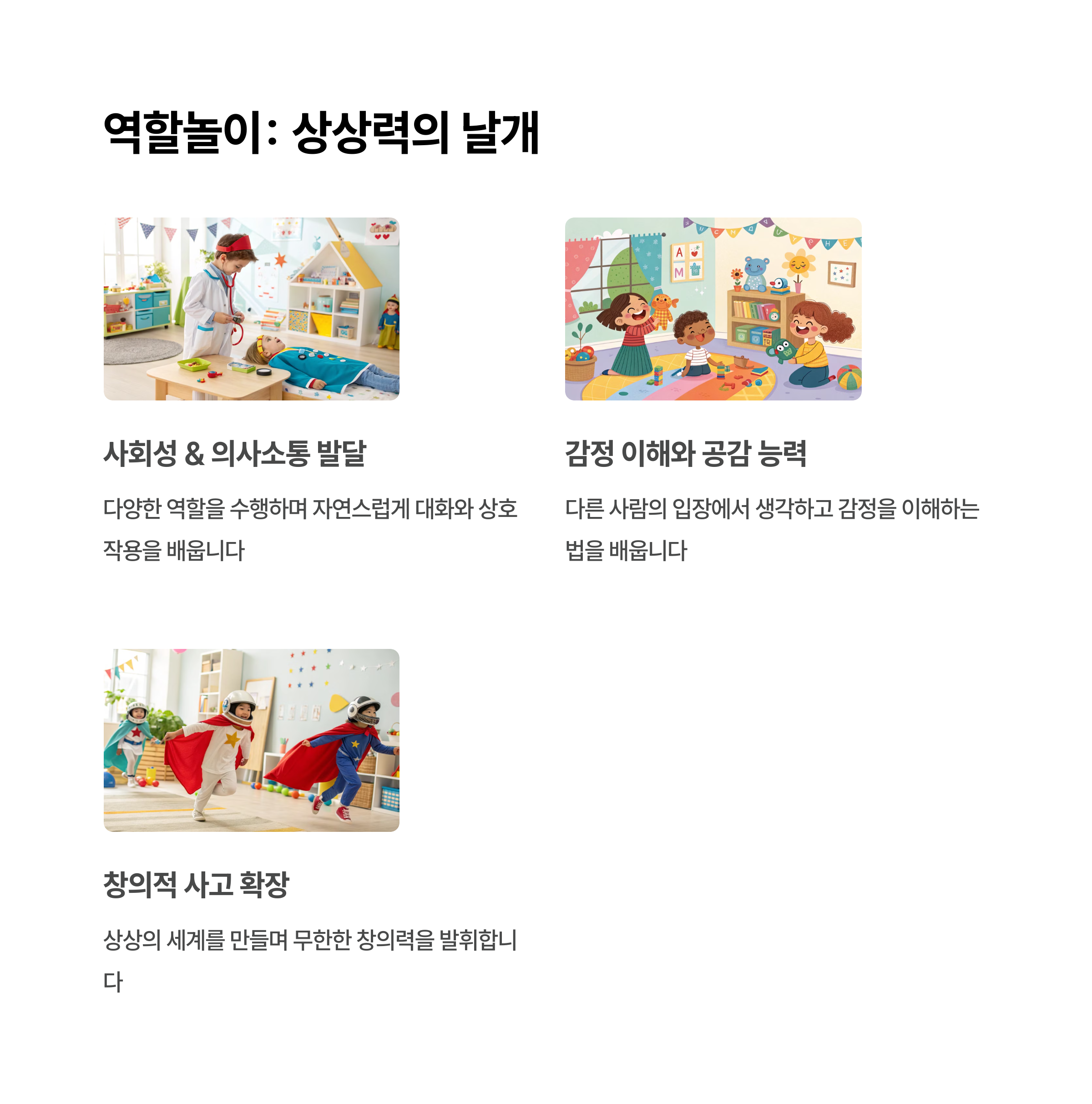 | 창의력 자극 놀이 | 문제 해결 중심의 역할놀이를 시도해보세요. |