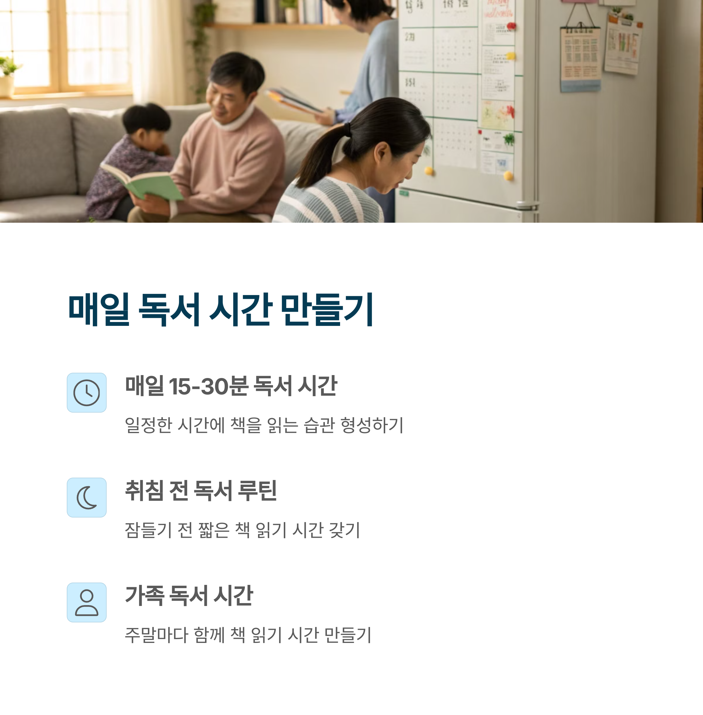 | 독서 시간 | 흥미 유도 | 가족 참여 |