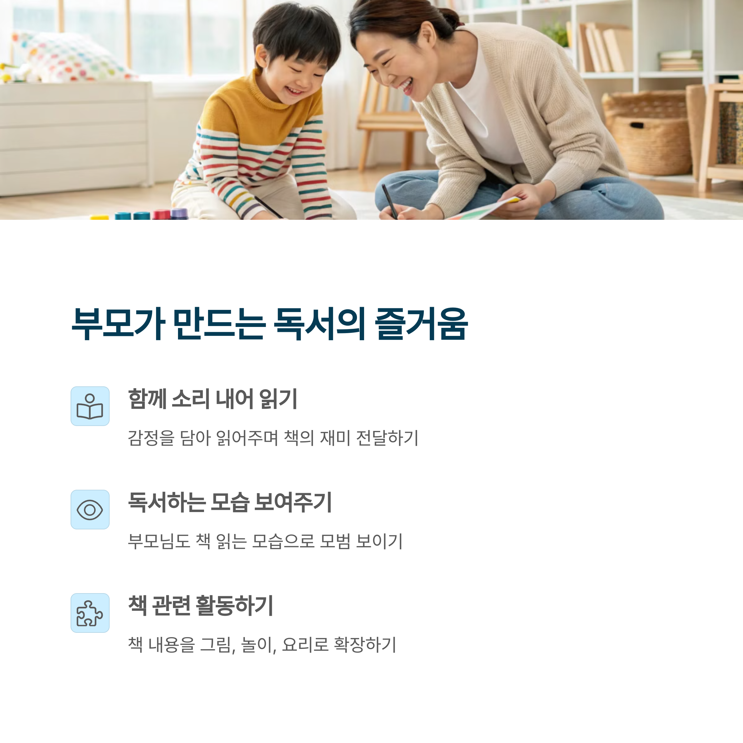 | 일정한 시간 확보, 반복 실천 | 아이가 고른 책, 질문과 상상 | 함께 읽기, 대화 나누기 |