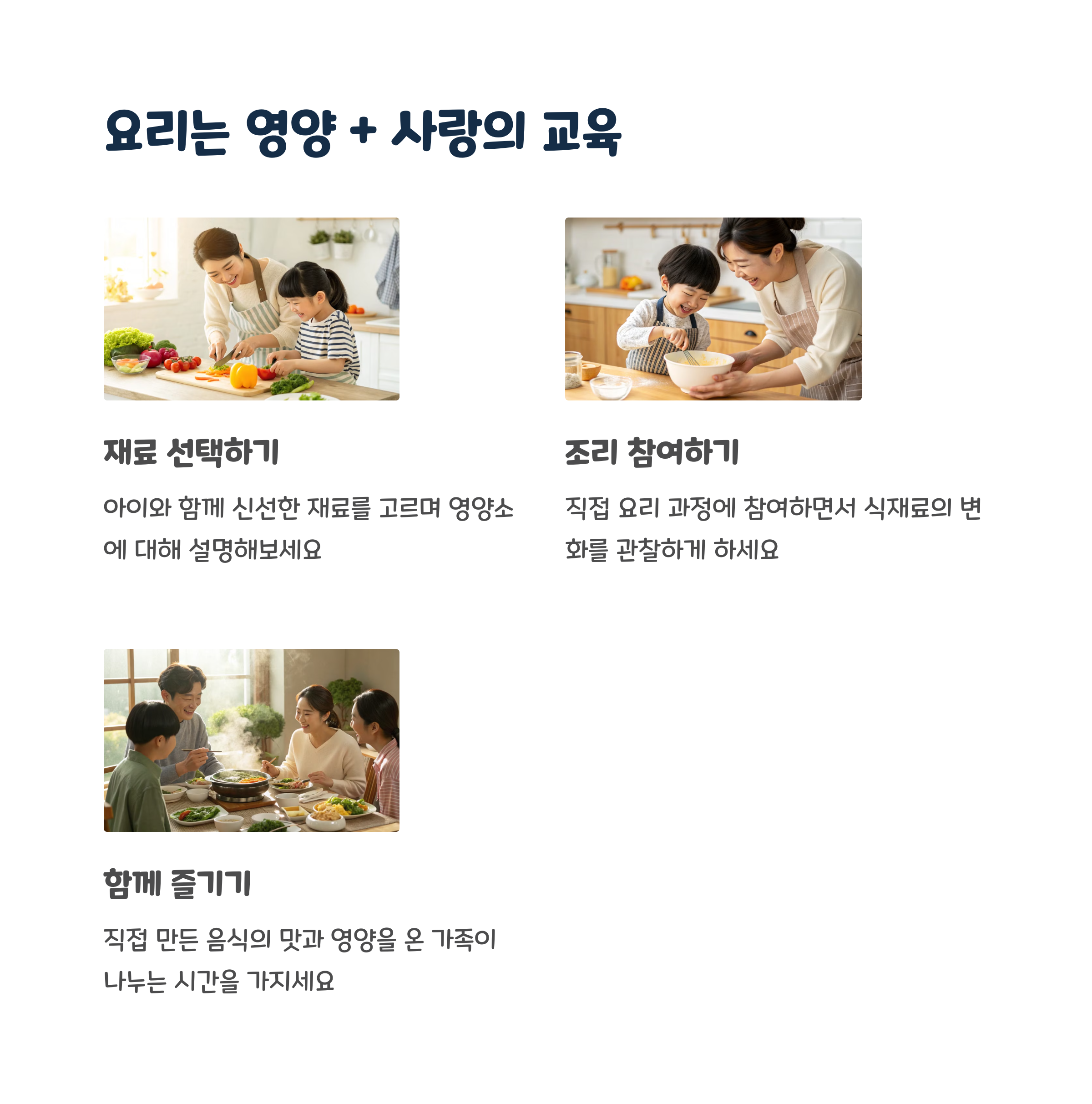 아이와 함께 바른 먹거리를 고르는 경험은 단순한 식사 이상의 가치를 갖습니다. 아이는 부모의 행동을 통해 배우며, 습관으로 내면화합니다. 장보기나 요리를 함께하는 과정에서 ‘왜 이 음식을 고르는지’를 알려주면 아이 스스로 건강한 선택을 할 수 있는 능력을 갖추게 됩니다. 바른 식습관 교육은 가장 효과적인 건강 투자입니다.