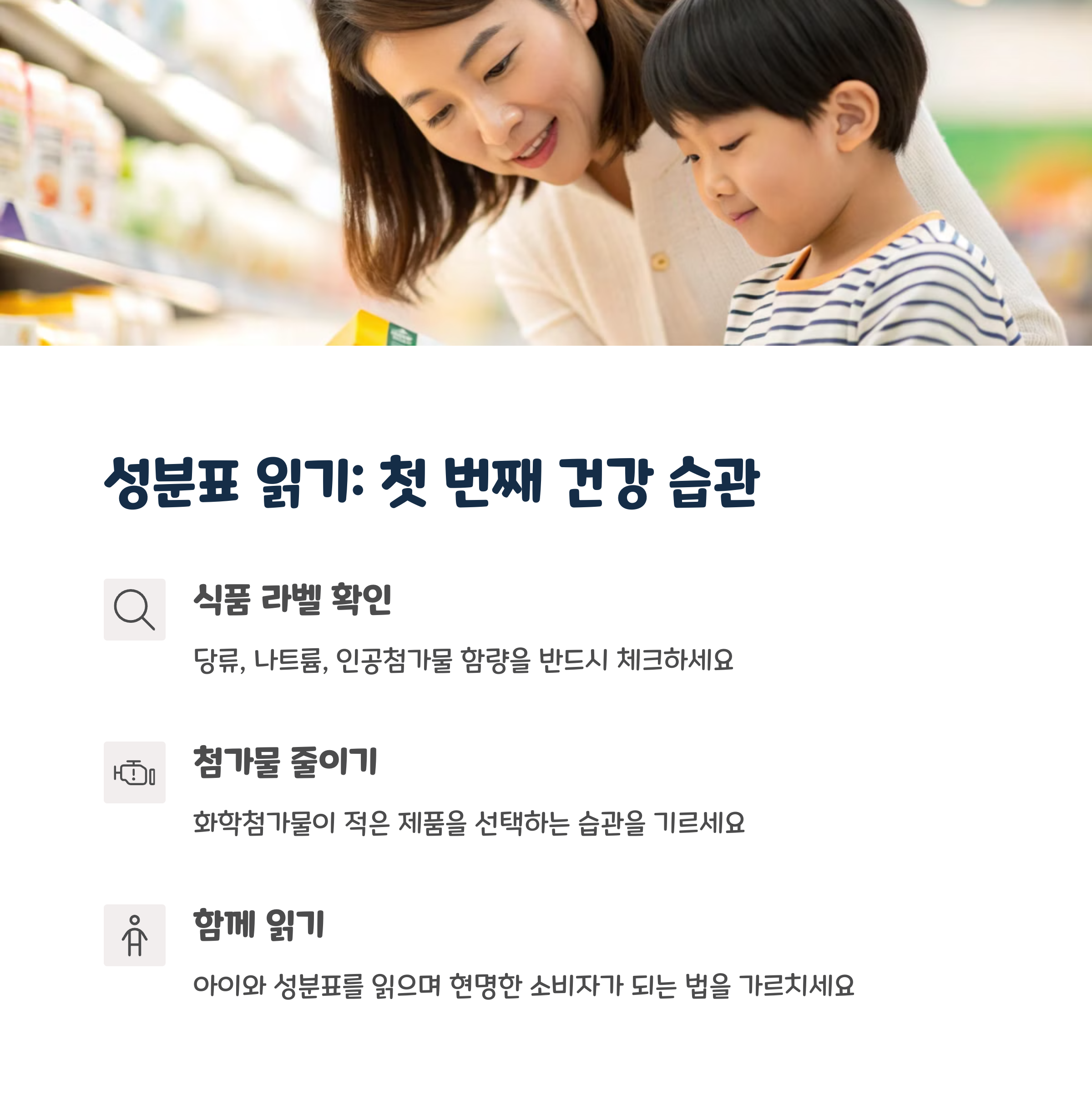 | 착색료, 보존료 없는 식품을 선택하는 습관 | 단백질, 섬유소, 칼슘 등 균형 잡힌 식단 구성 | 성분표와 함량을 보고 스스로 판단하는 힘 |