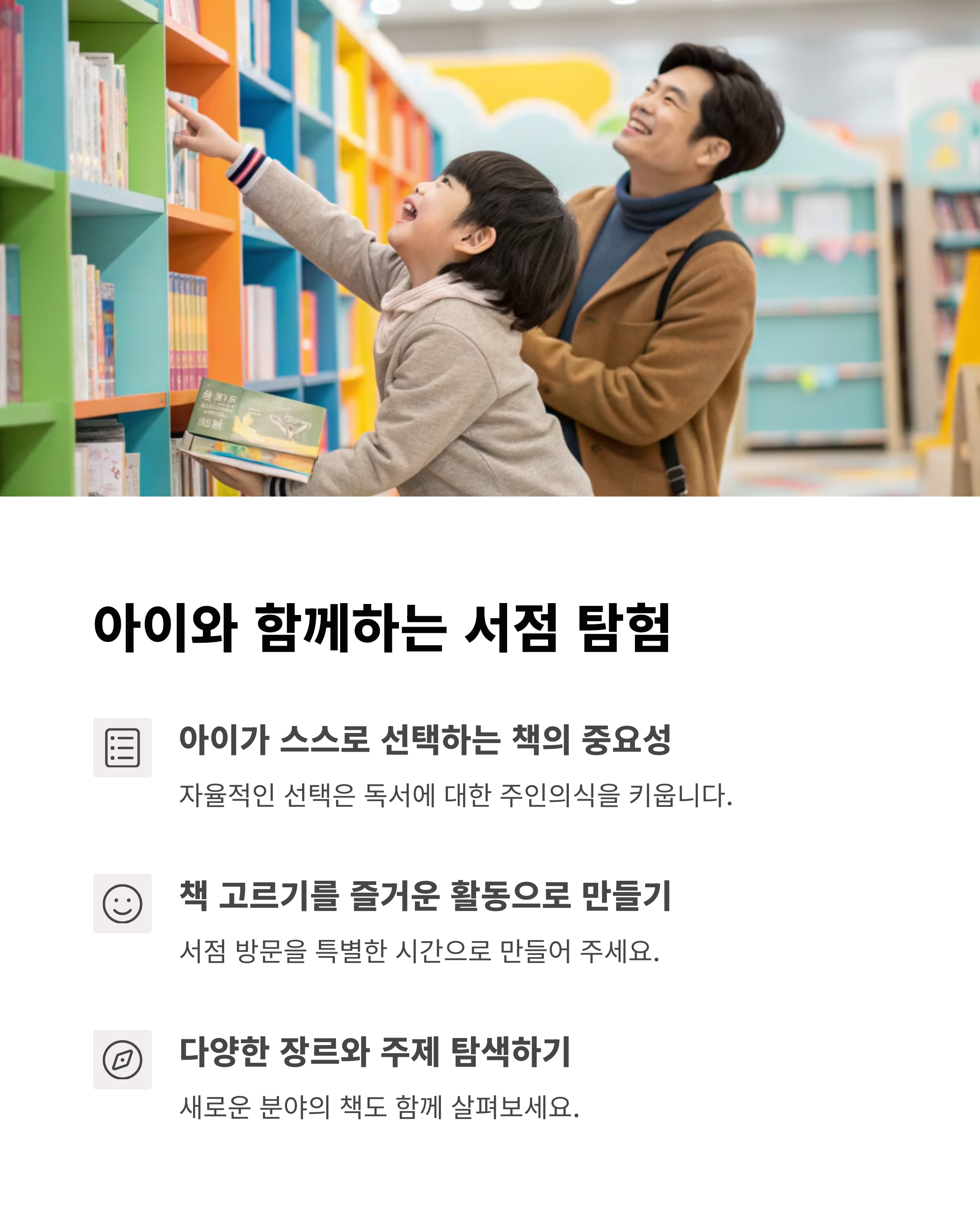 책을 읽고 나서 아이와 짧게 책 이야기를 나누는 시간도 중요합니다. “어떤 장면이 재밌었어?”, “이 책에서 배운 게 있을까?” 등 부담 없는 대화가 아이의 이해력과 사고력을 키워줍니다. 또한 책을 함께 사러 서점에 가는 경험은 독서를 ‘즐거운 일’로 기억하게 만들어줍니다. 부모의 작은 실천이 아이의 평생 독서 습관을 만듭니다.