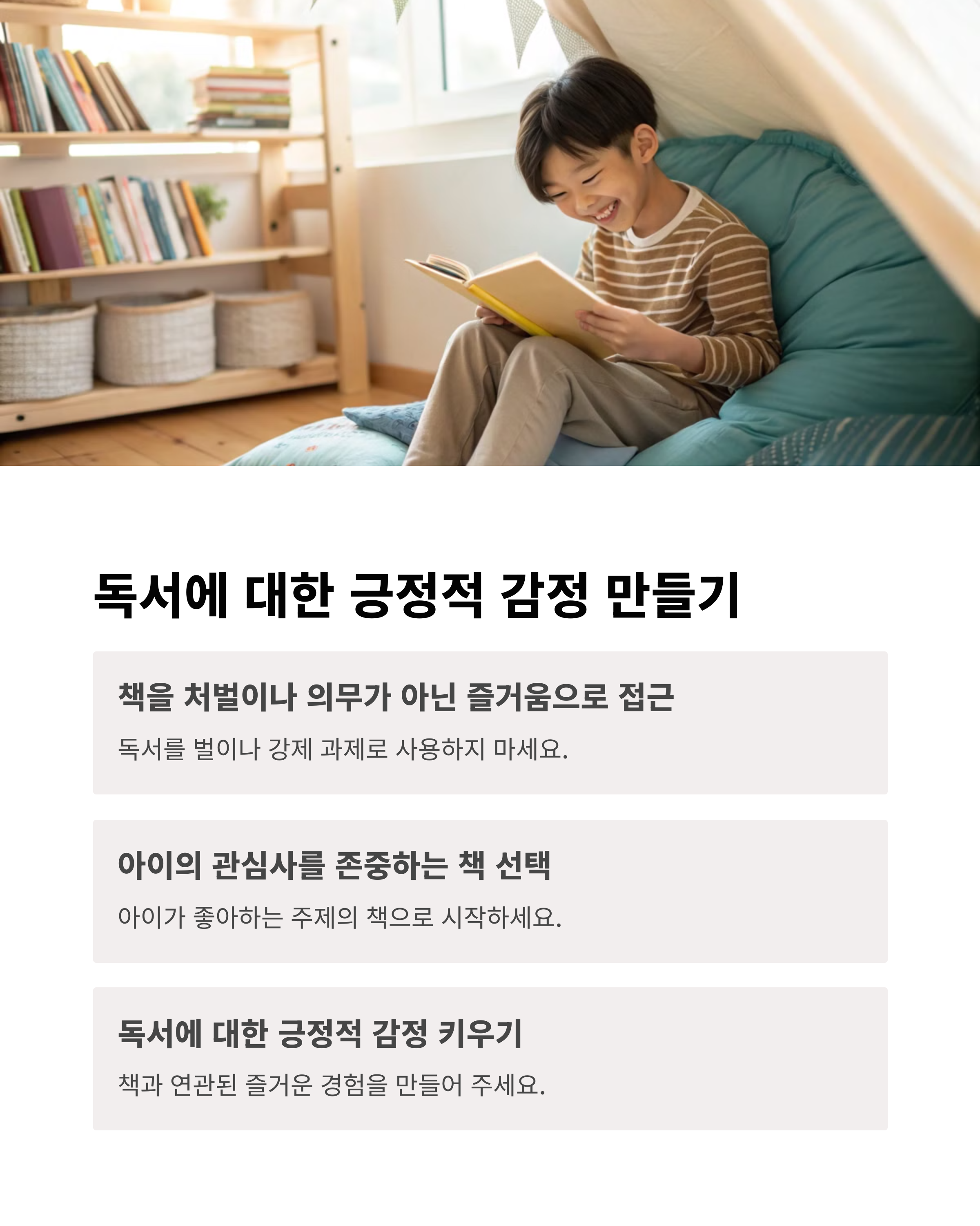 | 말보다 실천으로 보여주는 독서 습관 | 하루 20~30분 가족 독서 실천 | 책을 주제로 자유롭게 이야기 나누기 |