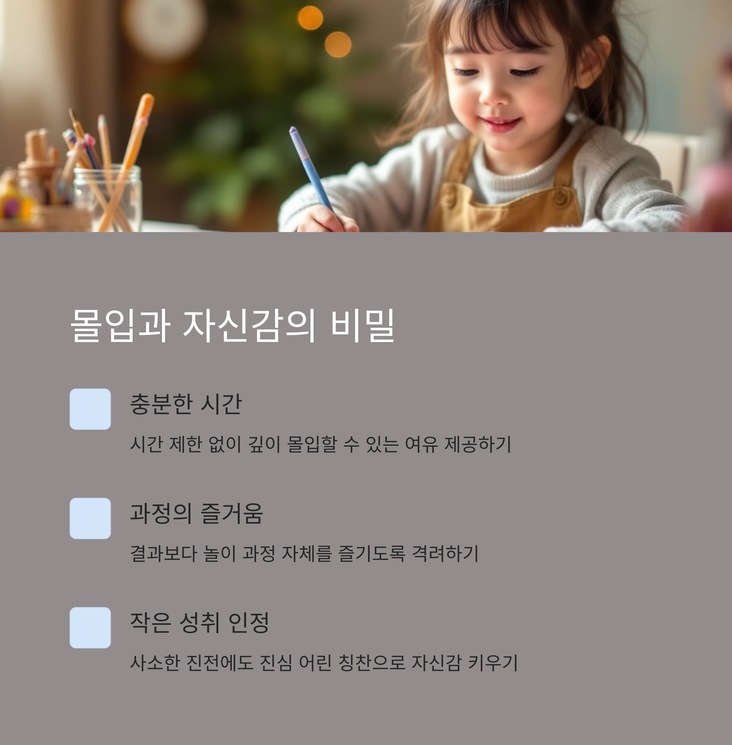 정답은 없습니다. 새로운 시도, 자유 표현, 몰입하는 모습이 창의력 성장의 신호입니다. 결과보다 과정을 지켜봐주세요.