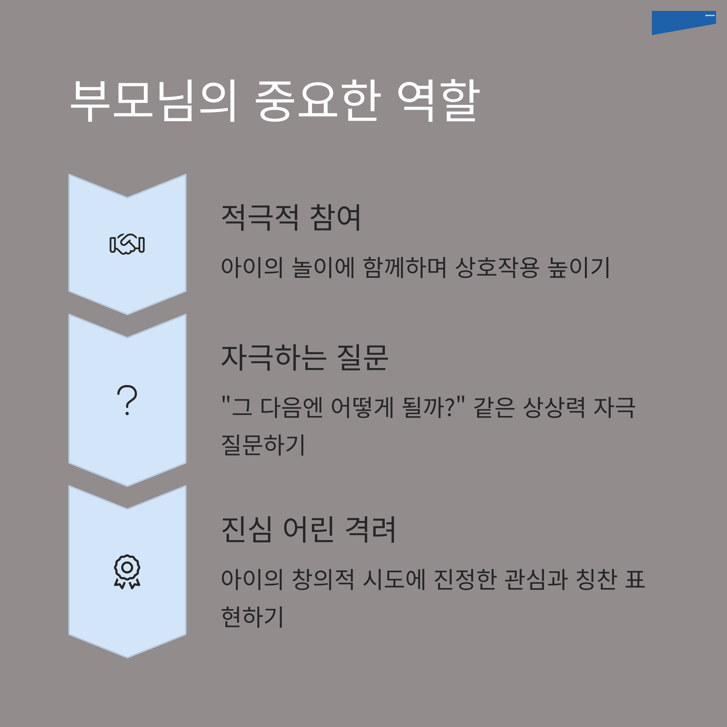 | 공간 제공, 방해 금지 | 새로운 조합, 창작물 존중 | 놀이 동참, 감정 공유 |