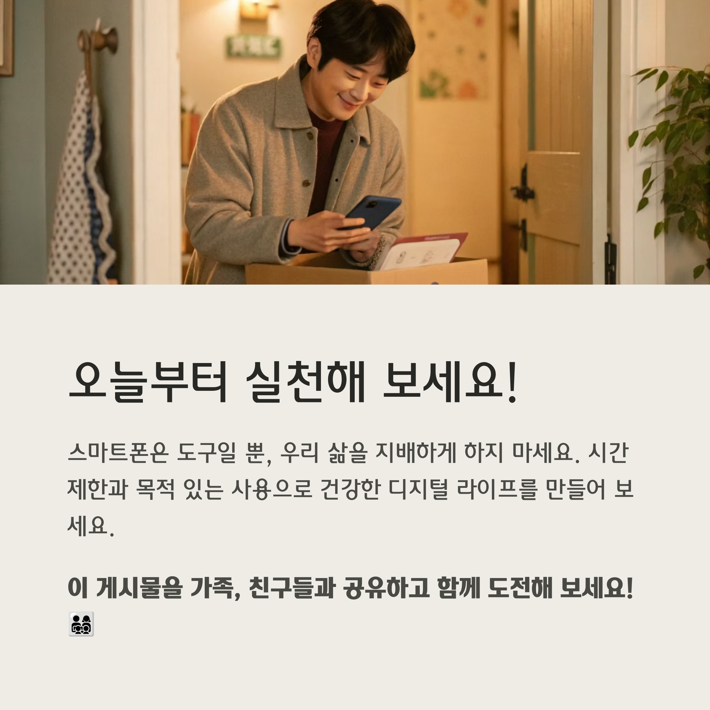 스마트폰은 일상에 꼭 필요한 도구이지만, 습관이 되지 않으면 삶의 질을 해칠 수 있습니다. 오늘부터라도 나만의 사용 규칙을 만들고 가족과 함께 실천해 보세요. 건강한 디지털 습관은 나와 우리 모두를 위한 좋은 시작이 될 수 있습니다.