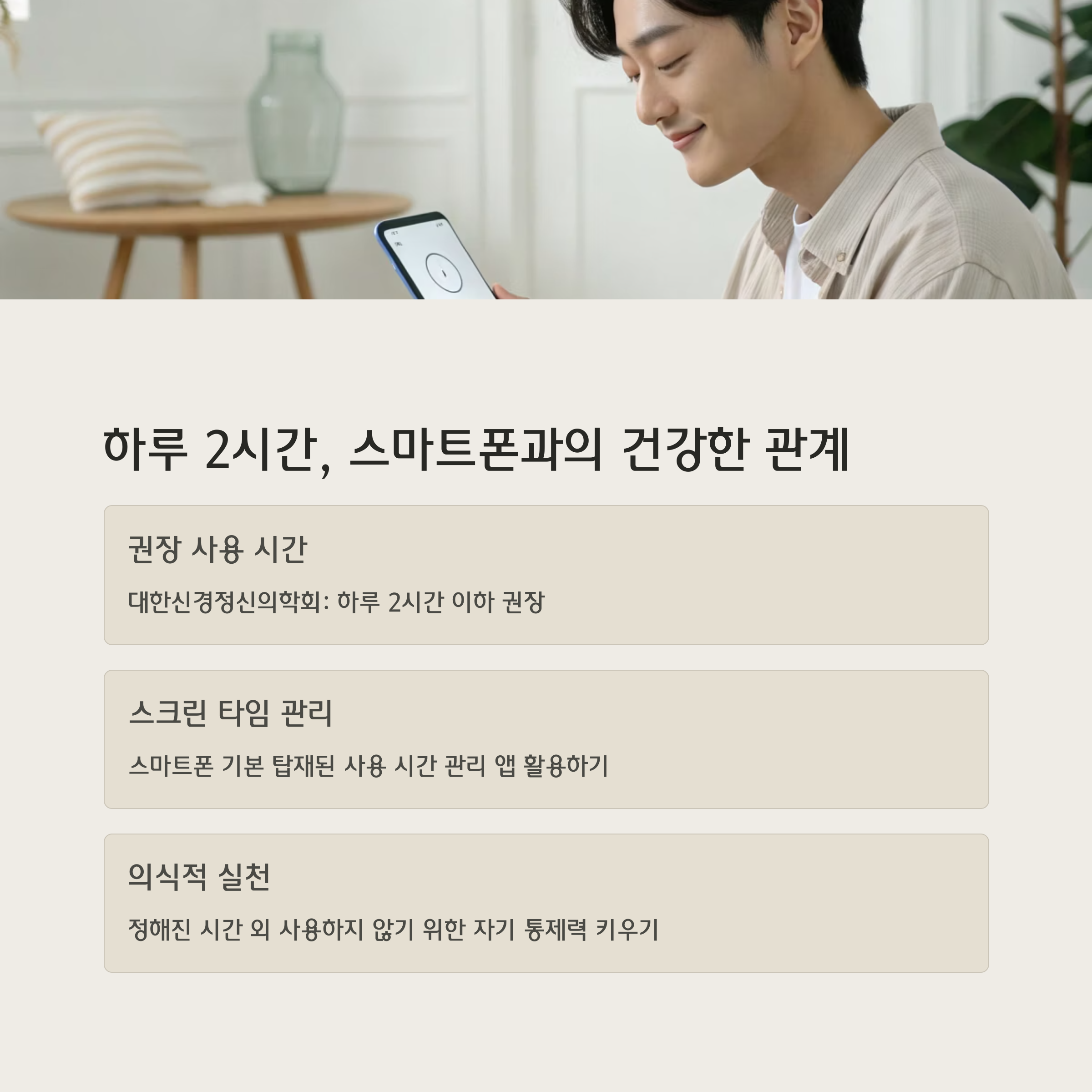 | 하루 총 사용시간 확인하기 | 특정 시간대만 사용하도록 루틴 설정 | 무의식적 습관 사용에 주의 |