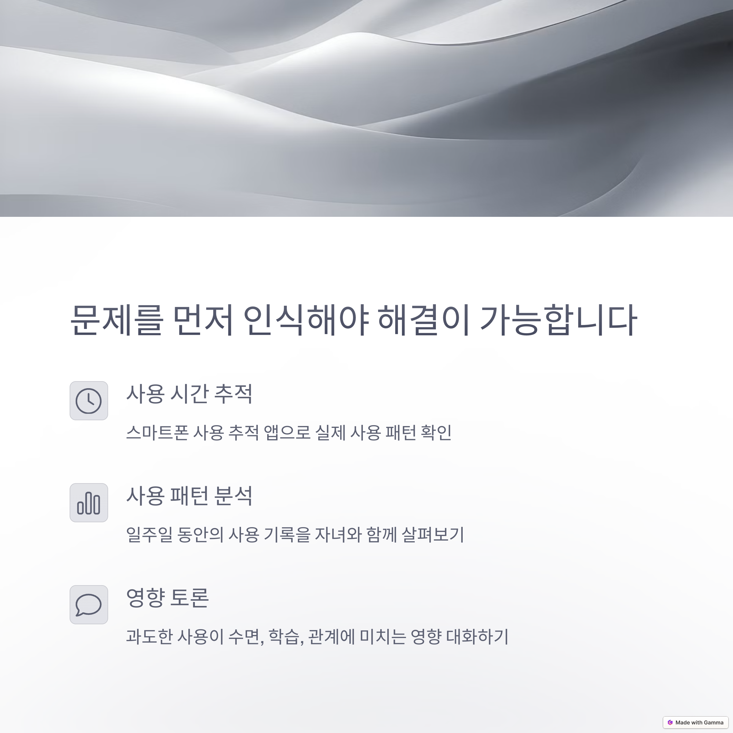 사용 습관을 자각하게 도와주며 스스로 줄이려는 동기를 부여합니다. 기록은 행동 변화의 첫 걸음입니다.