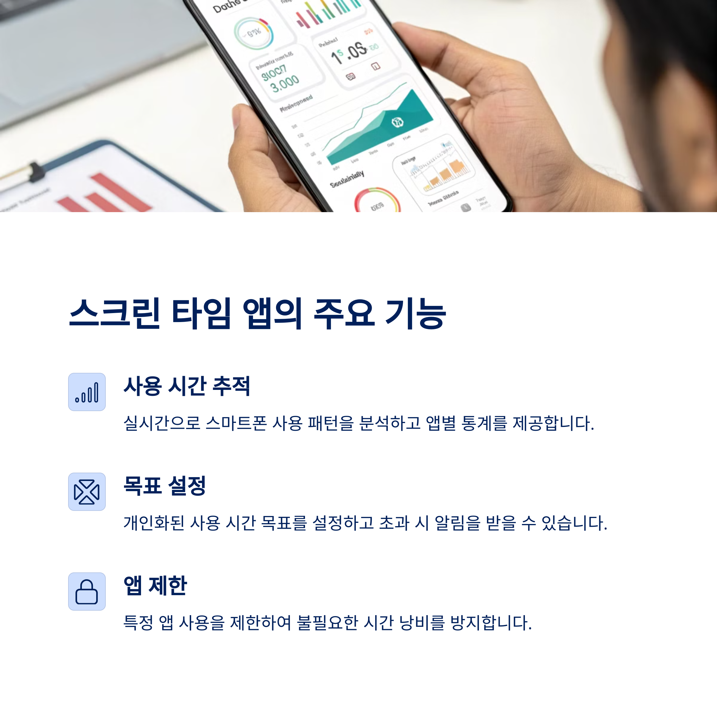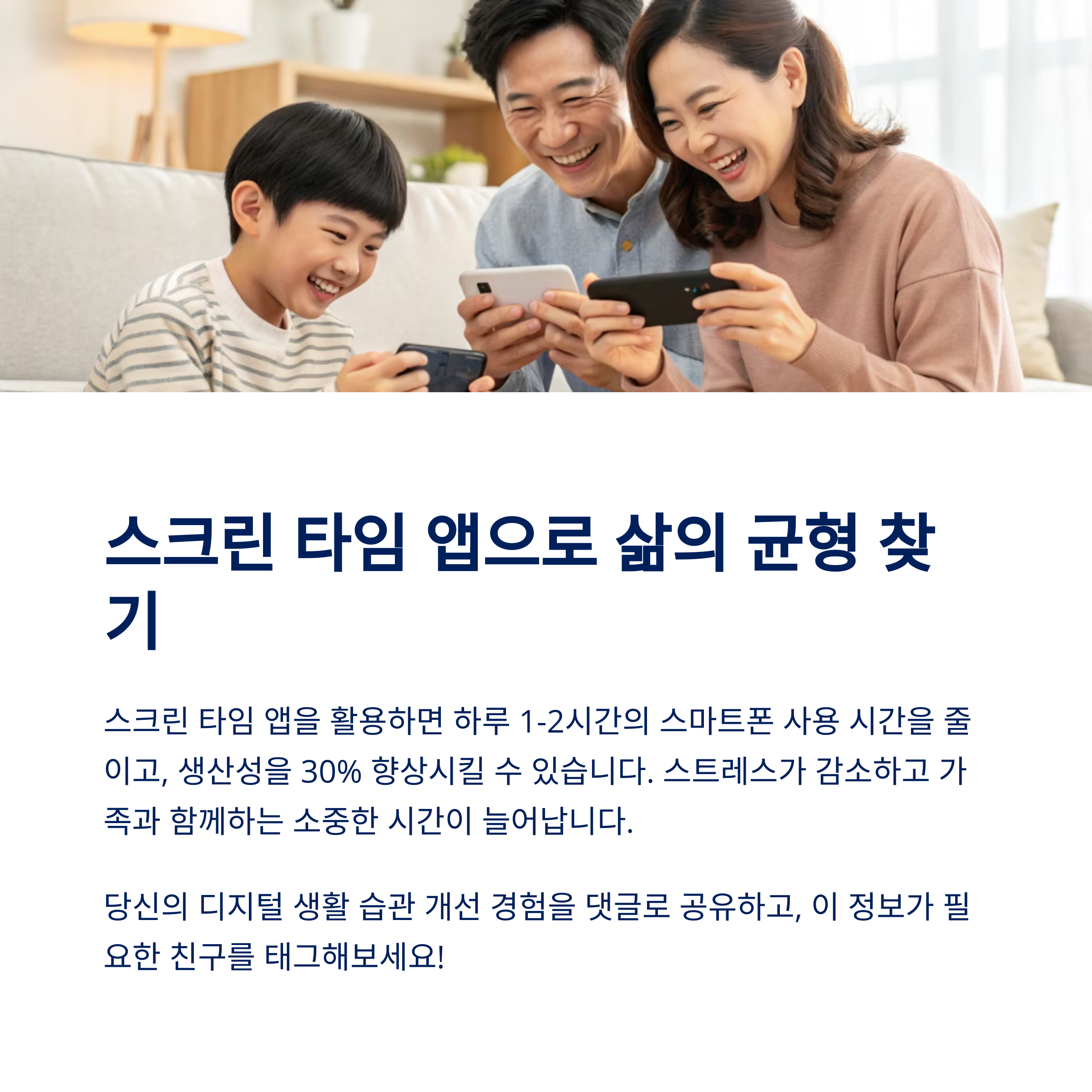 스마트폰은 편리하지만, 사용을 조절하지 않으면 삶의 질을 떨어뜨릴 수 있습니다. 스크린 타임 앱은 단순한 제한 도구가 아니라 자기 인식과 습관 변화를 도와주는 파트너입니다. 하루의 리듬을 되찾고 집중력을 높이며, 나와 아이 모두 건강한 디지털 습관을 만들 수 있도록 지금 바로 실천을 시작해보세요.