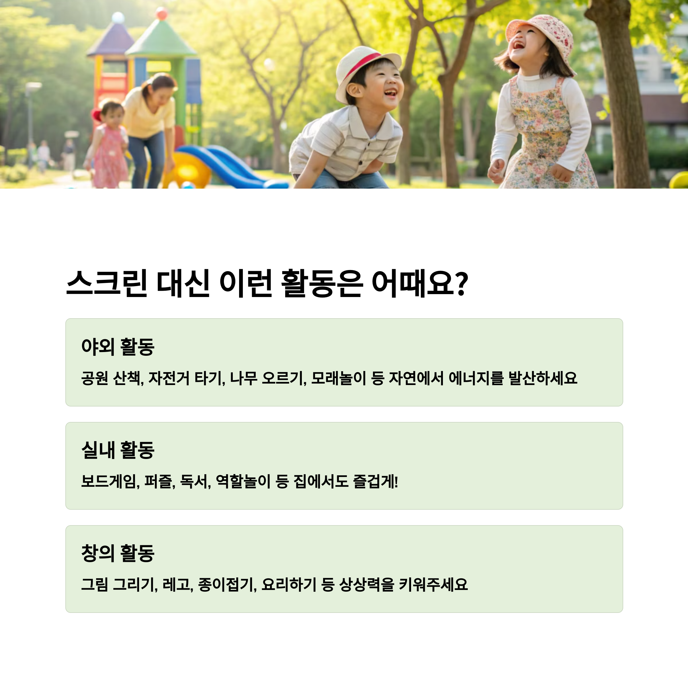| 스스로 조절 습관 형성 | 즐거운 아날로그 경험 제공 | 가족 소통, 정서 안정 강화 |