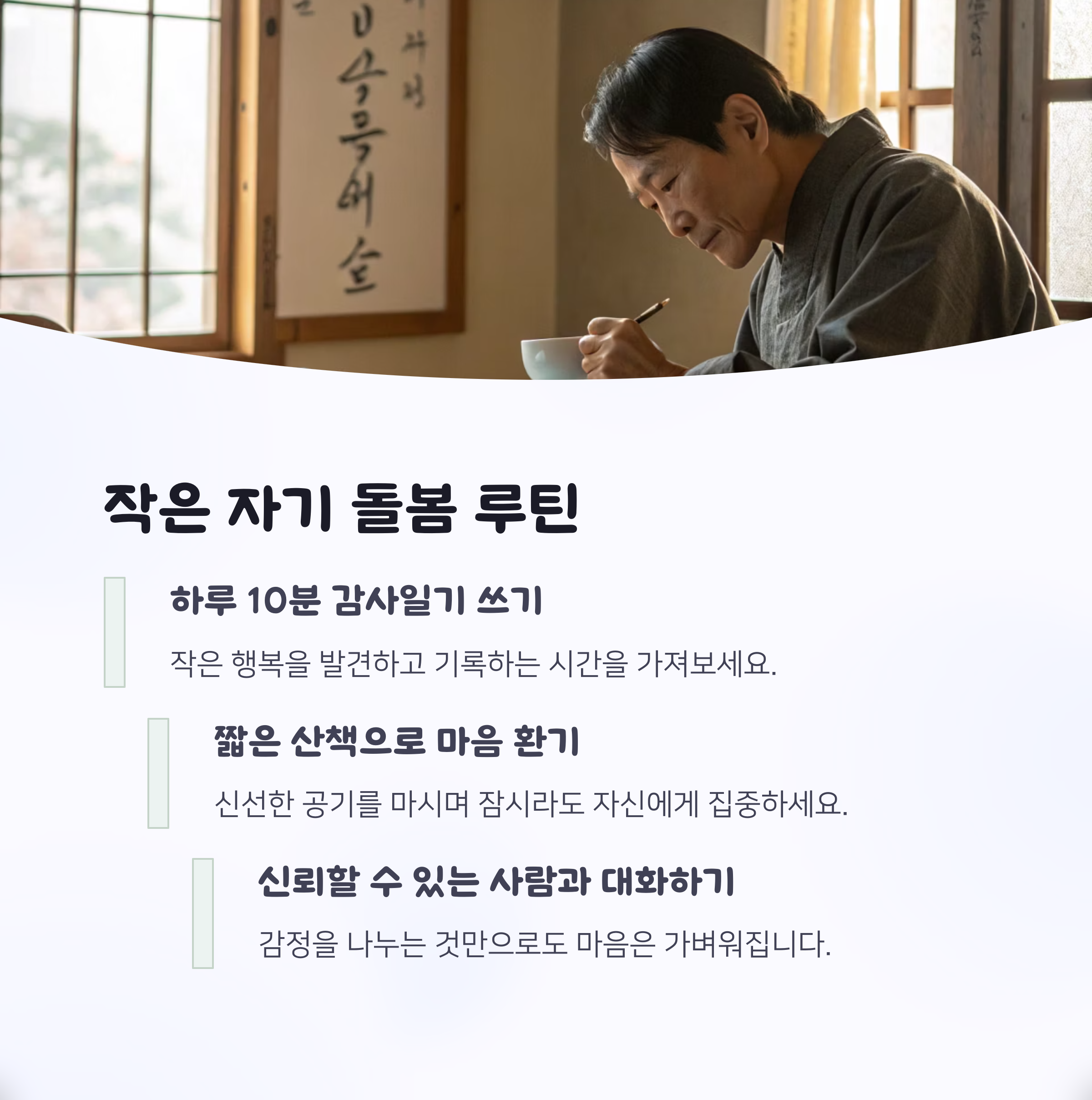 | 반복되는 일상에 지칠 때 대처하는 방법 | 감정 인식, 자기 돌봄의 시작 | 매일 일정한 시간의 산책과 정리 습관 |