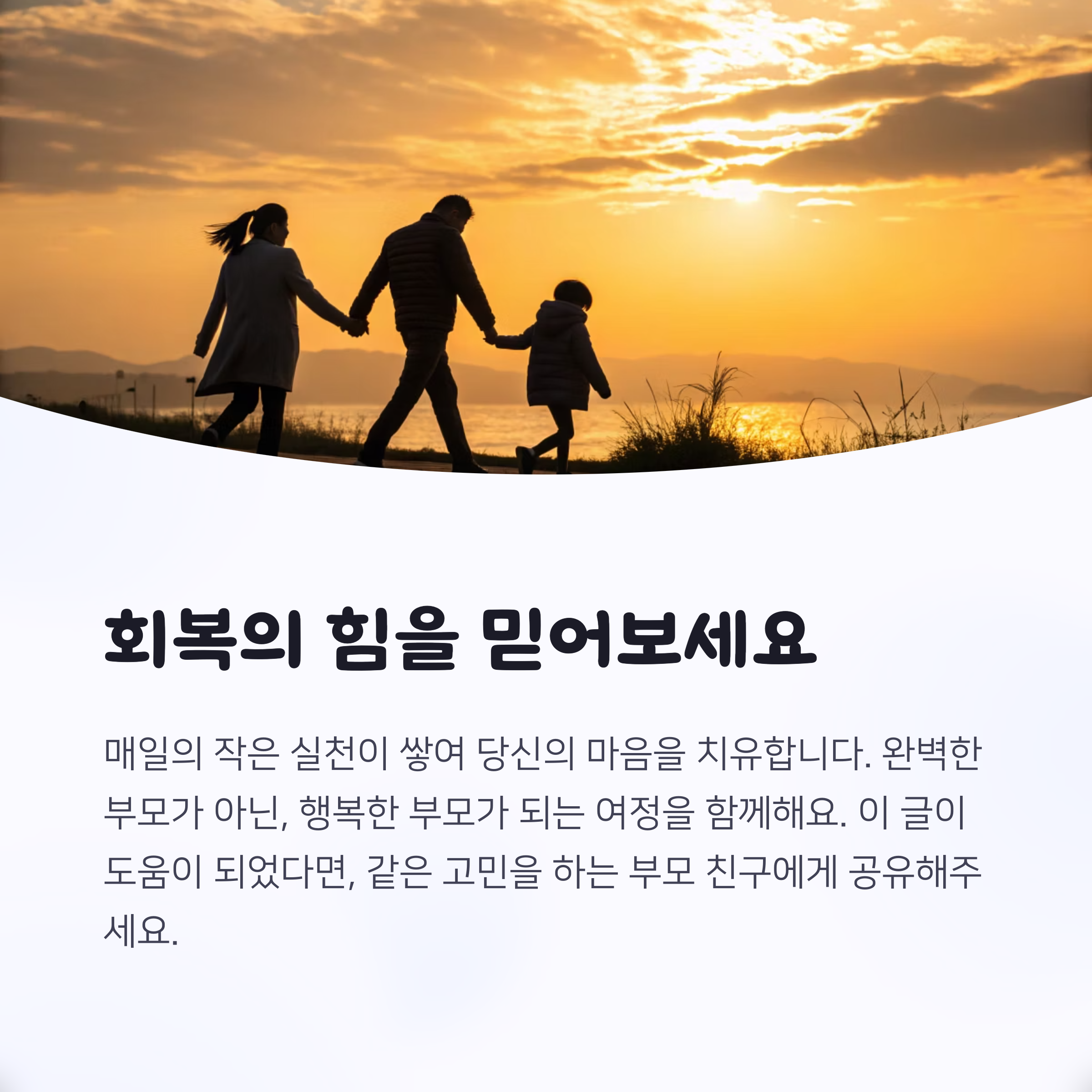 육아는 누구에게나 쉽지 않은 여정입니다. 그렇기에 나 자신을 돌보는 시간은 더 중요하죠. 감정을 숨기기보다 들여다보고, 가끔은 내려놓고, 나도 소중한 사람이라는 걸 잊지 마세요. 지금 이 순간도 열심히 살고 있는 당신은 충분히 멋집니다. 오늘은 잠깐이라도 나를 위한 루틴을 만들어보세요. 아이와 함께 웃고 싶은 그 마음, 먼저 당신의 마음이 따뜻해야 가능하니까요.