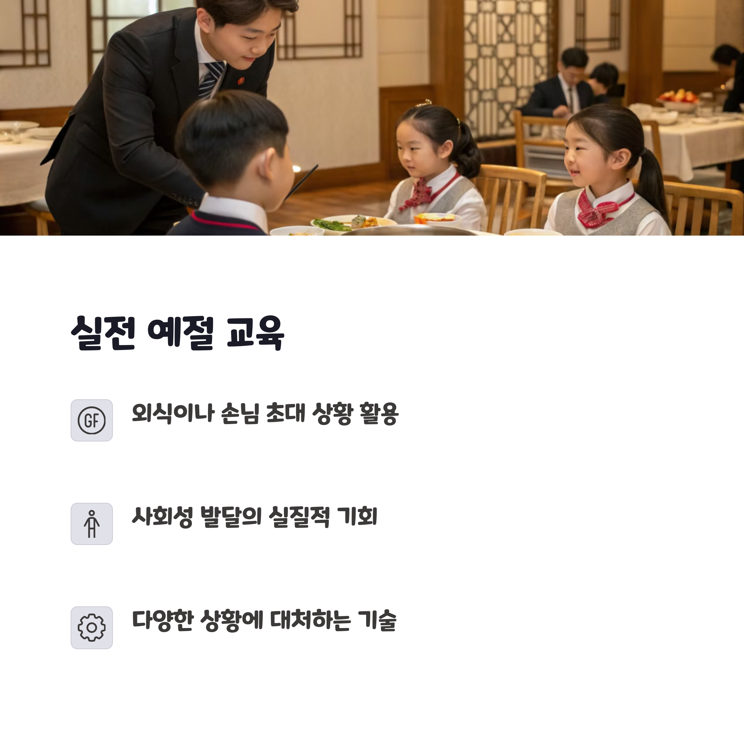 | 식탁 위에서 기본 인성과 태도를 자연스럽게 배웁니다. | 놀이처럼 접근하면 유아기 예절 학습이 쉬워집니다. | 반복 루틴을 통해 건강한 습관을 만들어 갑니다. |