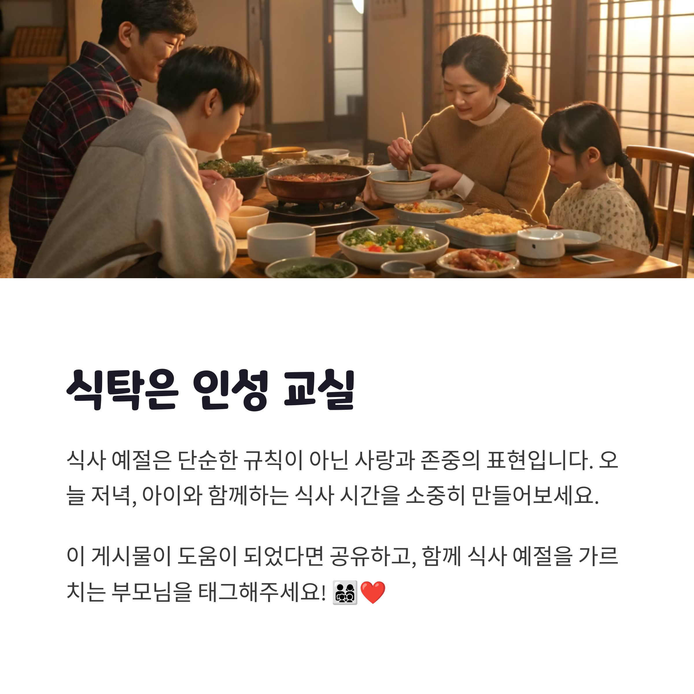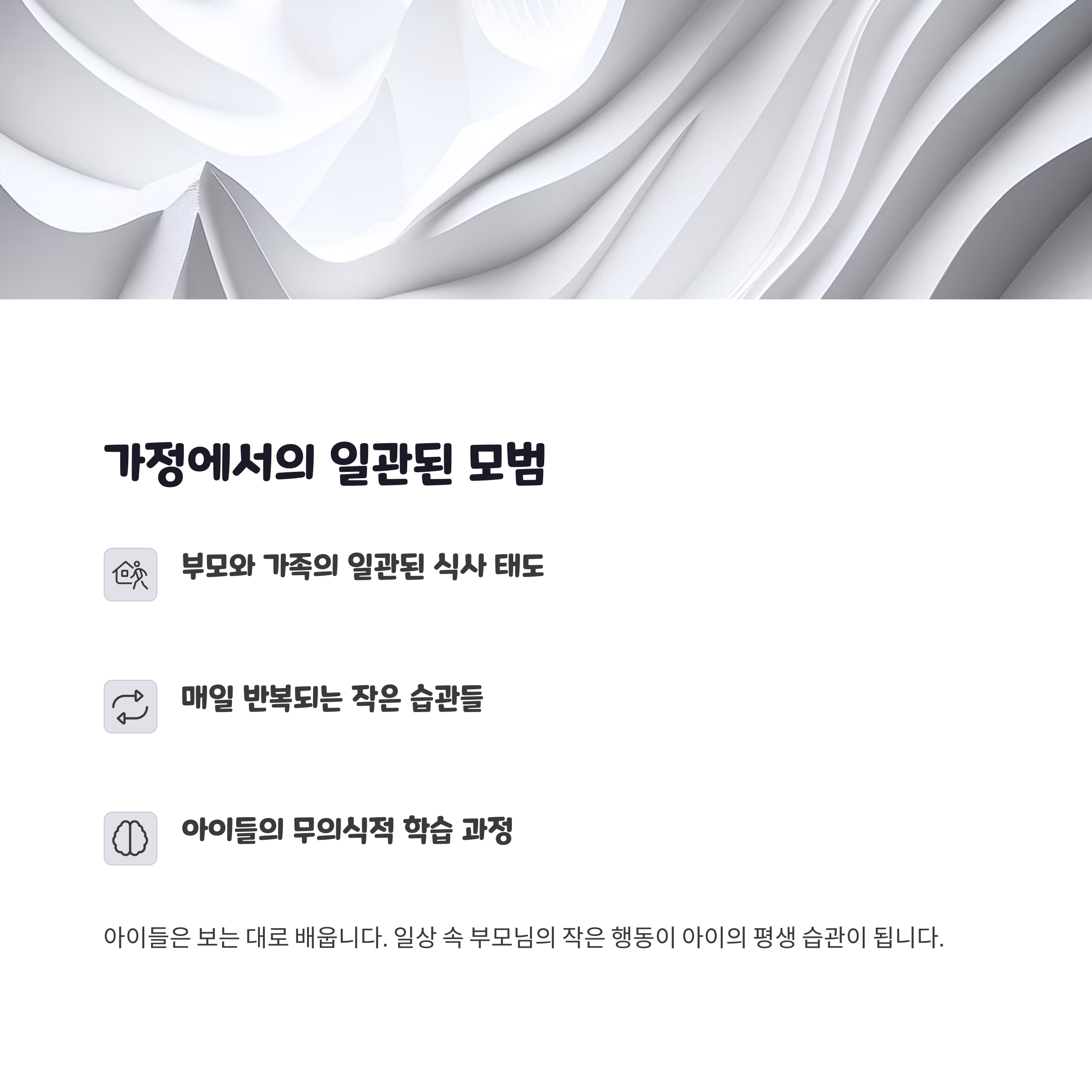 | 가족의 식사 태도가 최고의 교육이 됩니다. | 칭찬과 공감이 아이 행동을 긍정적으로 이끕니다. | 정해진 규칙보다 분위기와 일관성이 더 중요합니다. |