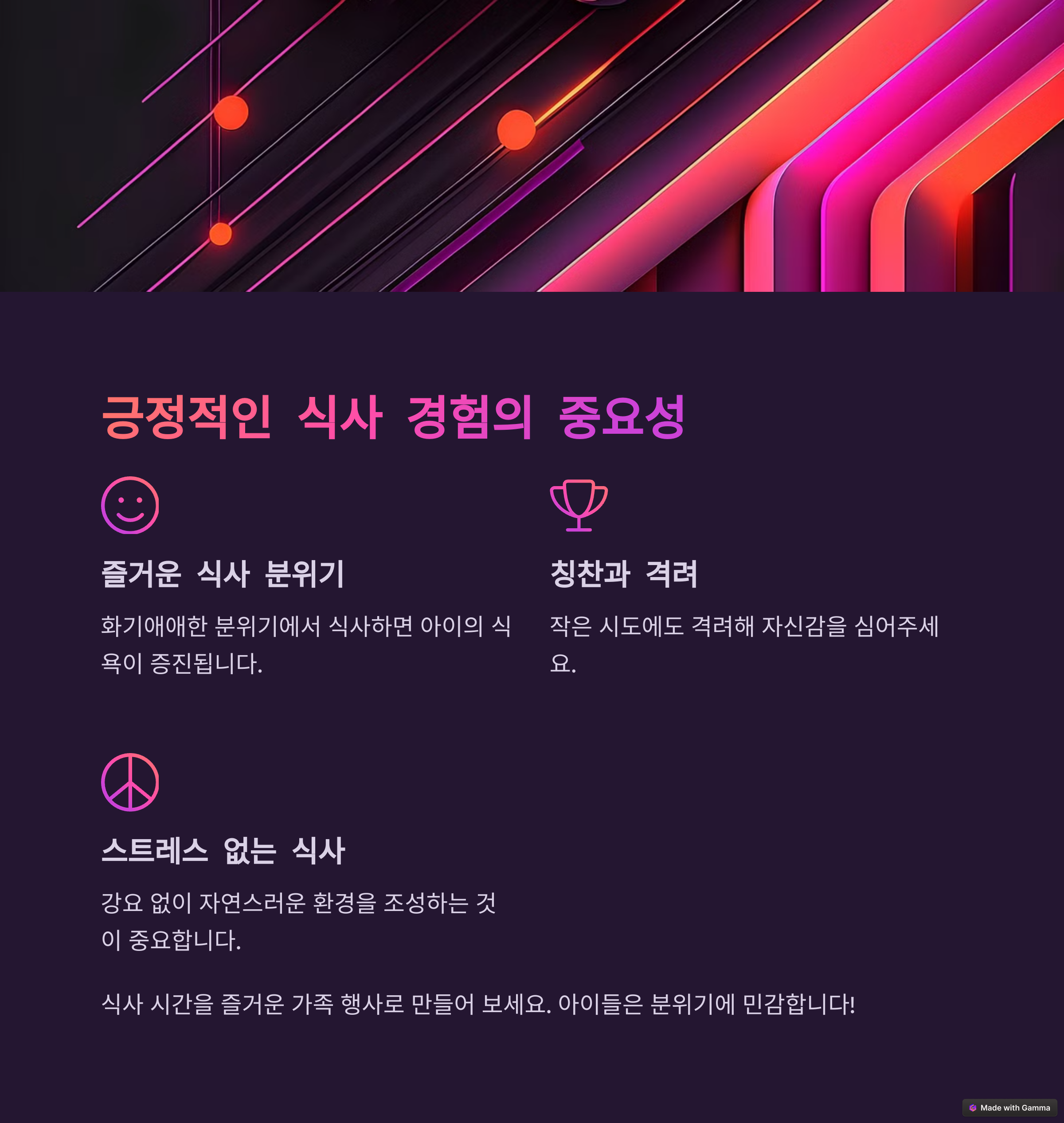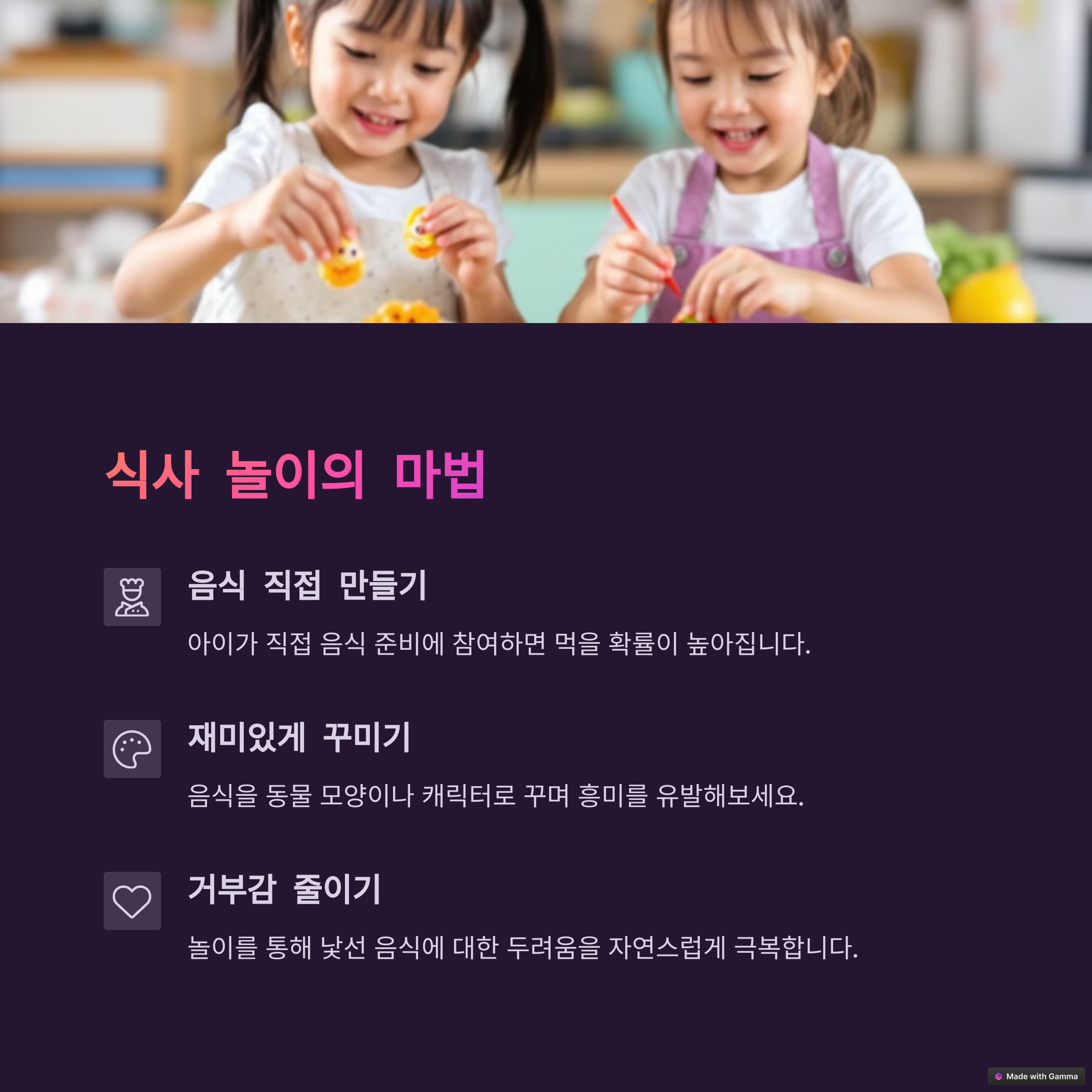 | 스트레스 없는 식사 환경 필요 | 놀이로 음식에 호기심 유발 | 꾸준한 시도로 긍정적 변화 |