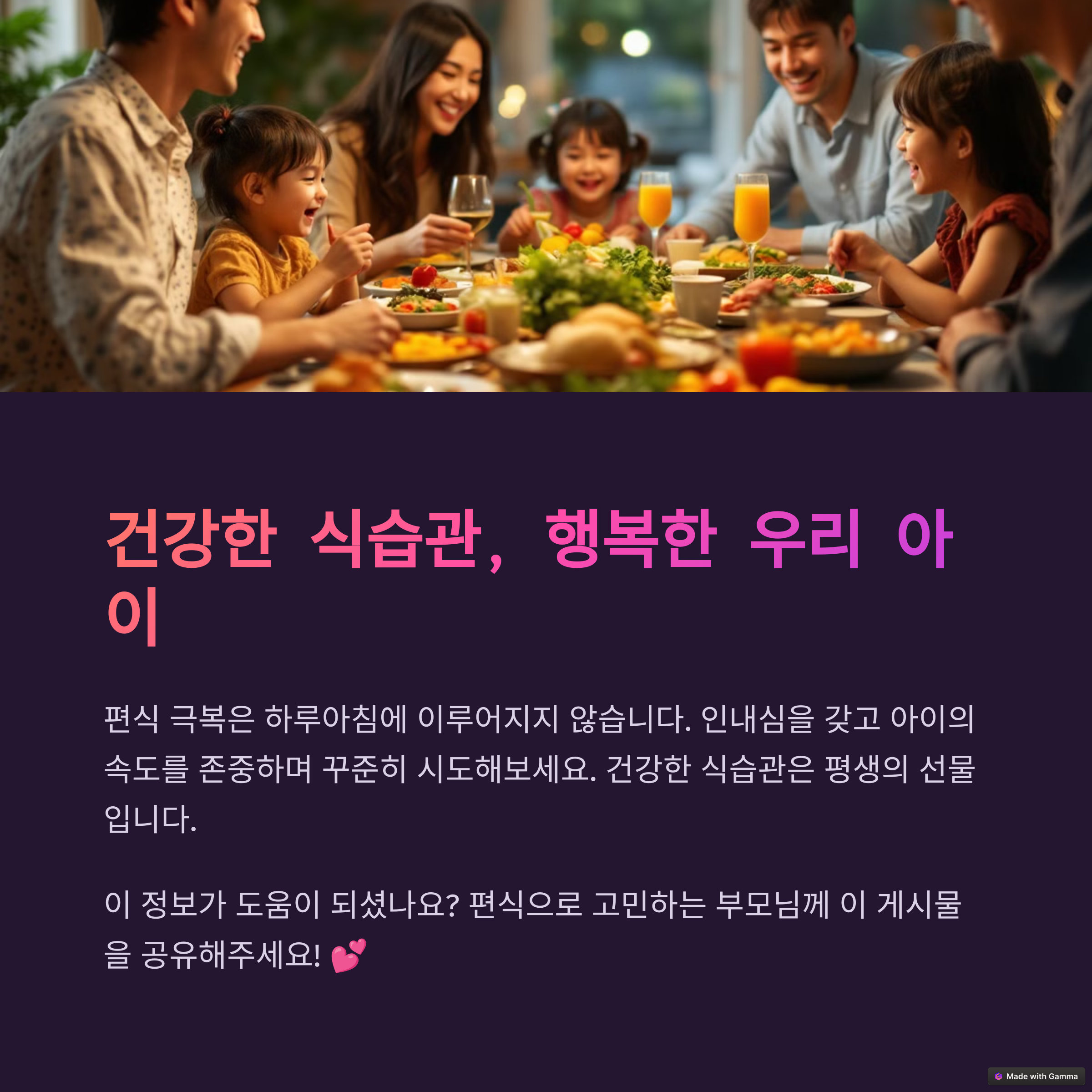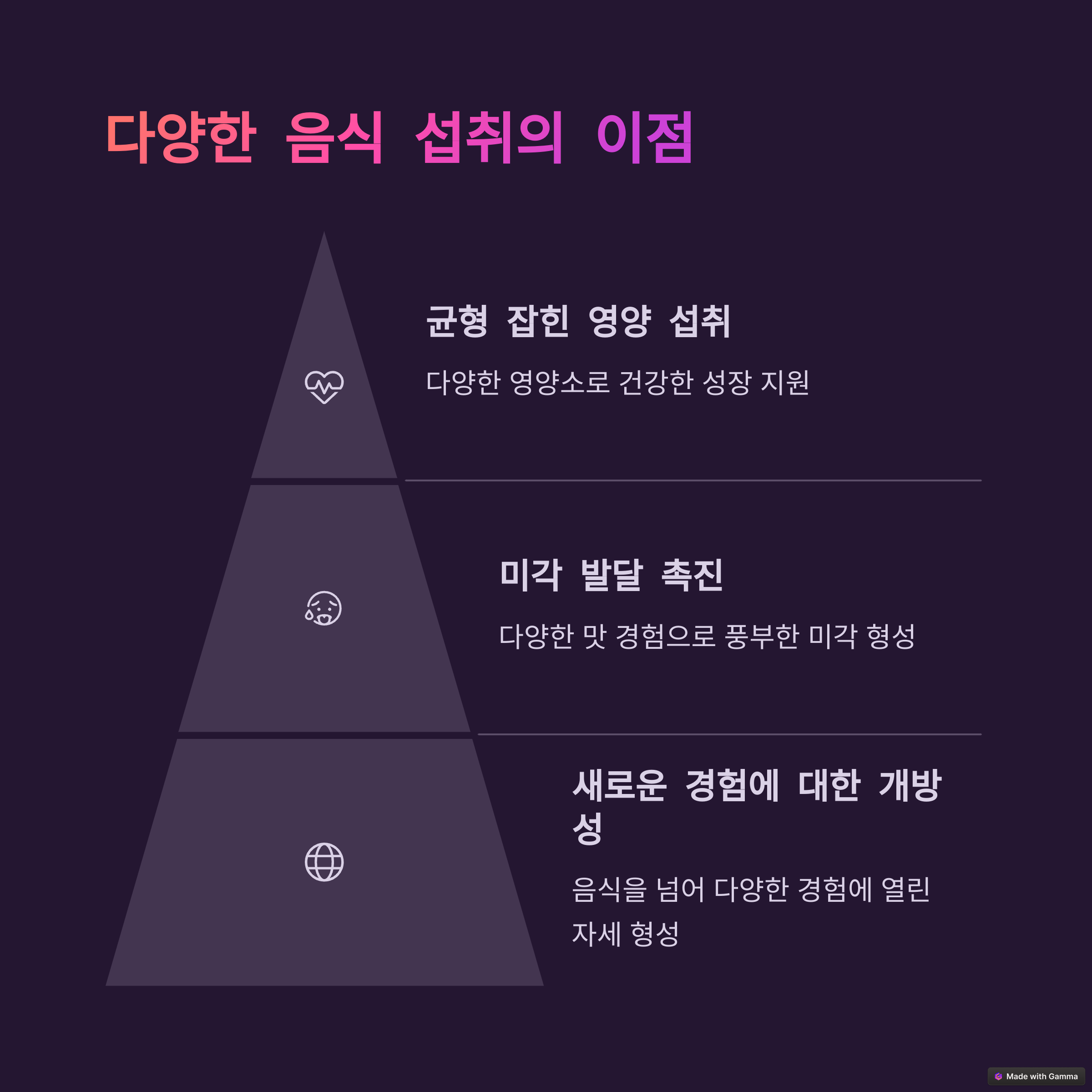 편식 해결의 열쇠는 즐거운 경험과 자율성입니다. 놀이와 참여를 통해 아이는 자연스럽게 다양한 음식을 경험하고 음식에 대한 긍정적 태도를 갖게 됩니다. 식사는 즐거워야 합니다. 지금 바로 실천해 보세요.