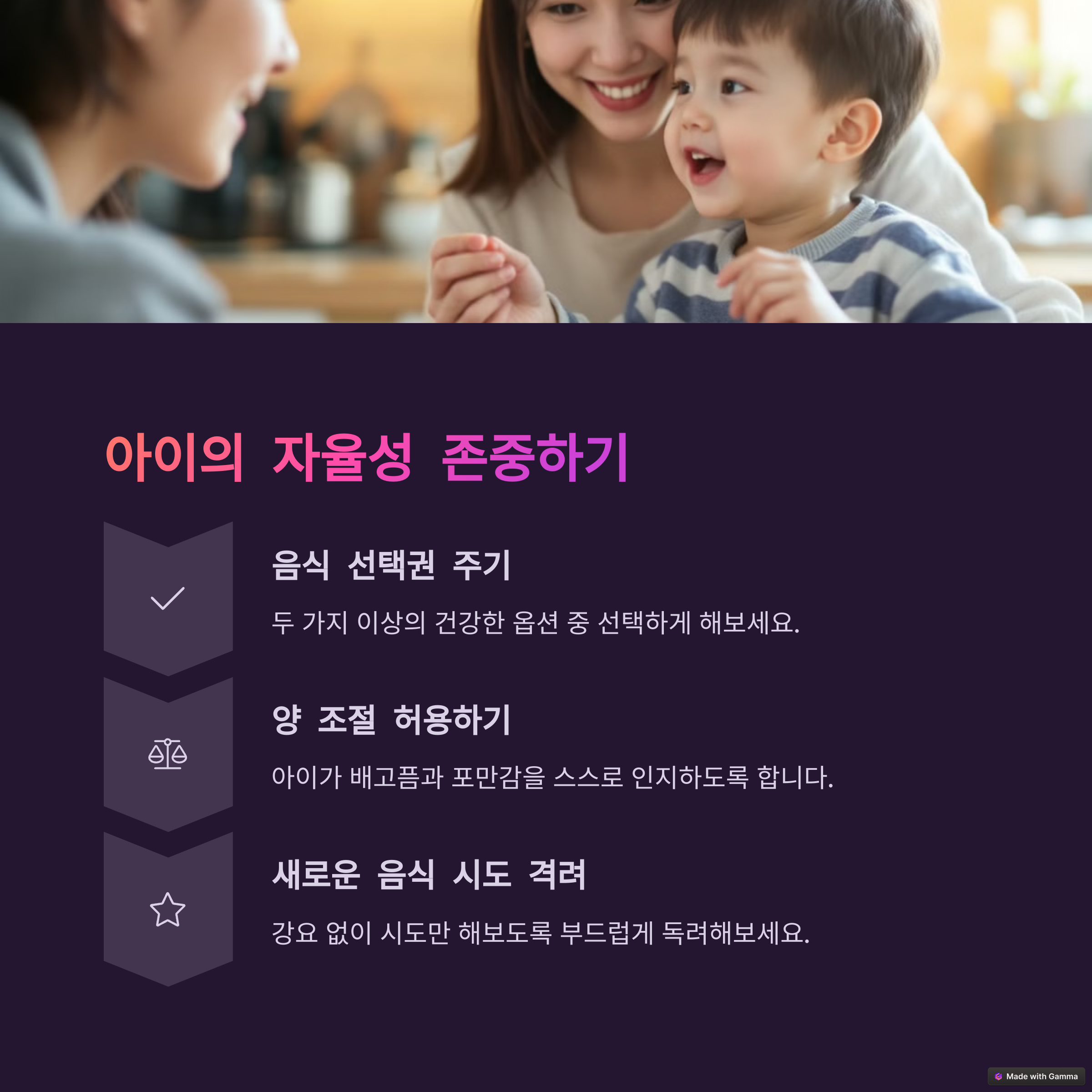 아이 중심의 식사 경험을 만들어 주세요. 선택과 자율성을 존중하면 아이는 부담 없이 새로운 음식을 시도하게 됩니다. 칭찬과 즐거움이 식사 시간에 함께할 때 편식은 자연스럽게 줄어듭니다.