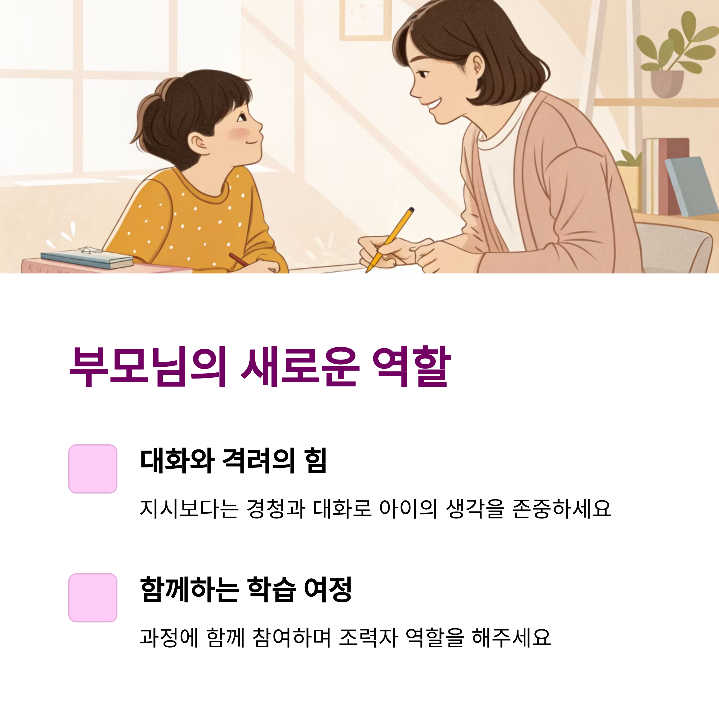| 부모 역할 | 강요보다 조율, 지시보다 격려와 지원 |