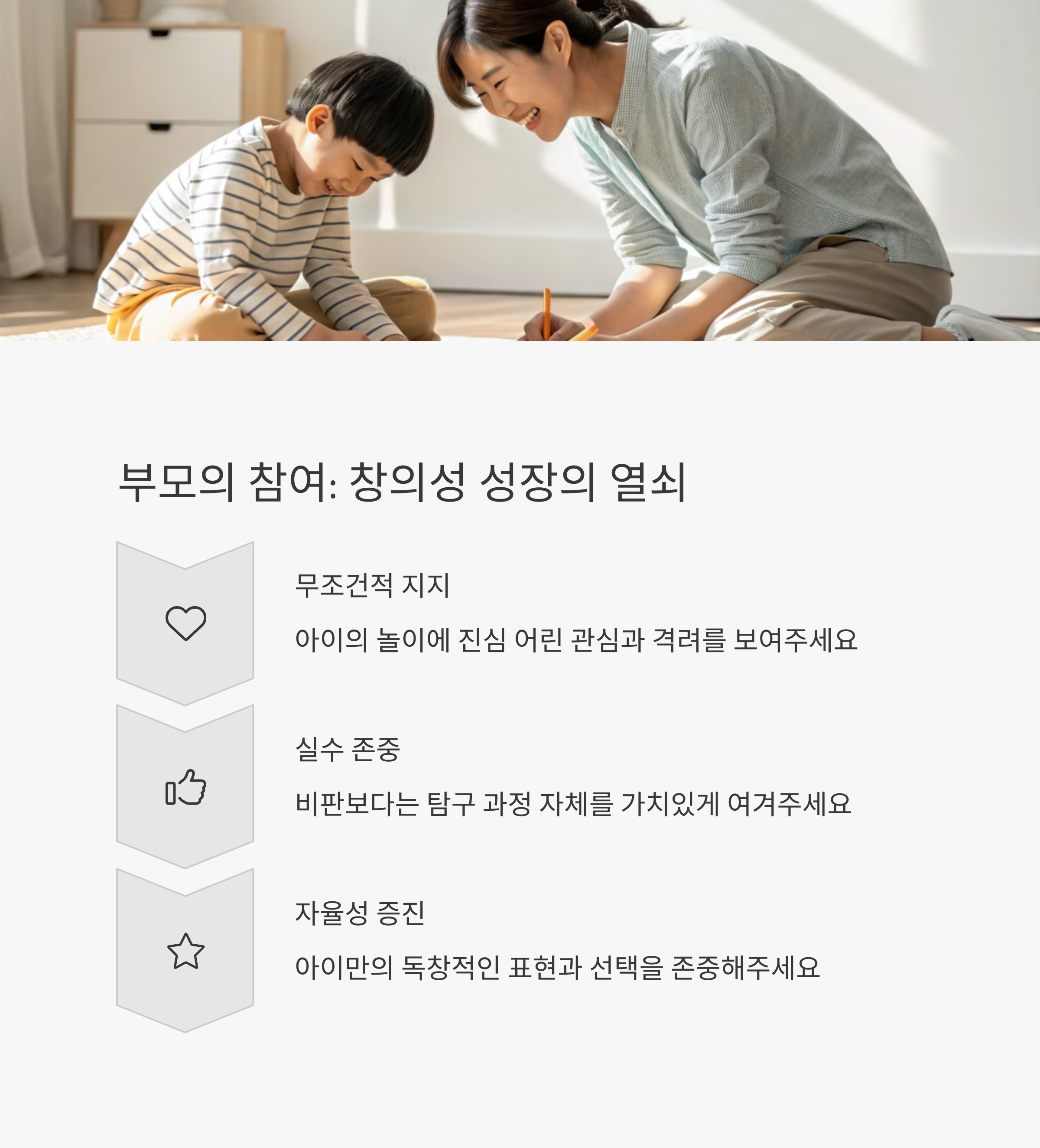 창의력은 타고나는 것이 아니라 자라나는 것입니다. 아이가 다양한 시도를 하고, 실수 속에서 배우며 자신만의 생각을 만들어가는 그 과정 자체가 창의성입니다. 놀이를 공부처럼 바라보기보다, 놀이 속에서 배우는 힘을 인정하고 존중해 주세요. 부모의 따뜻한 관심과 열린 자세가 아이의 상상력과 표현력을 키우는 가장 큰 힘이 됩니다. 오늘도 우리 아이의 마음이 자유롭게 펼쳐질 수 있도록, 놀이의 문을 활짝 열어주세요.