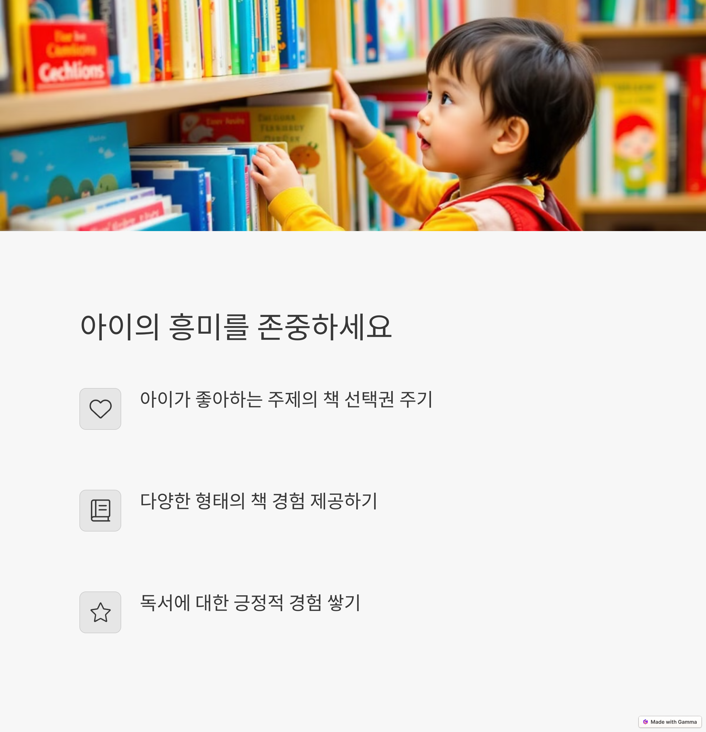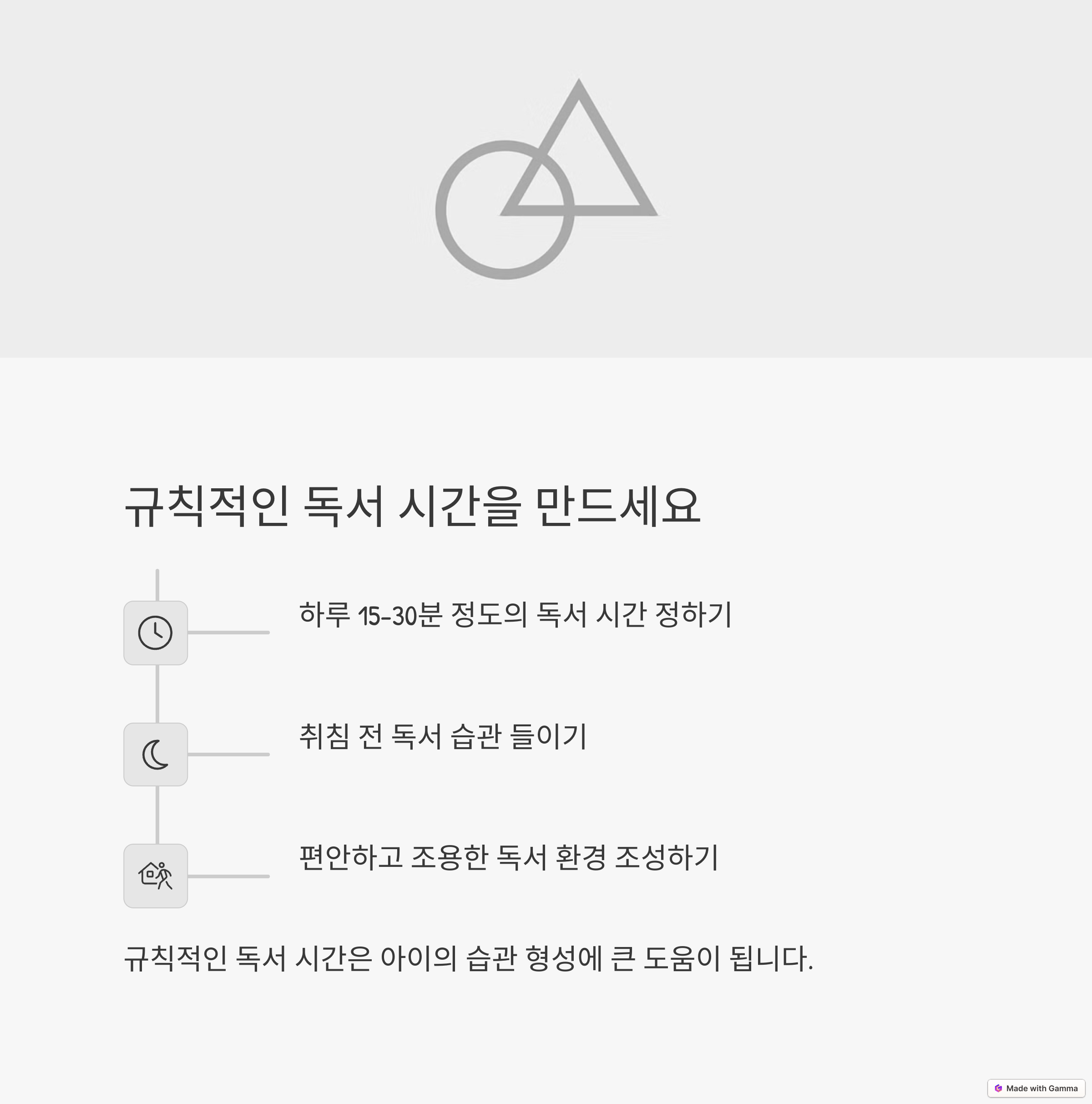 | 규칙적 환경과 즐거운 분위기 조성 | 흥미 기반의 책 선택 권장 | 독서 모범과 격려 제공 |