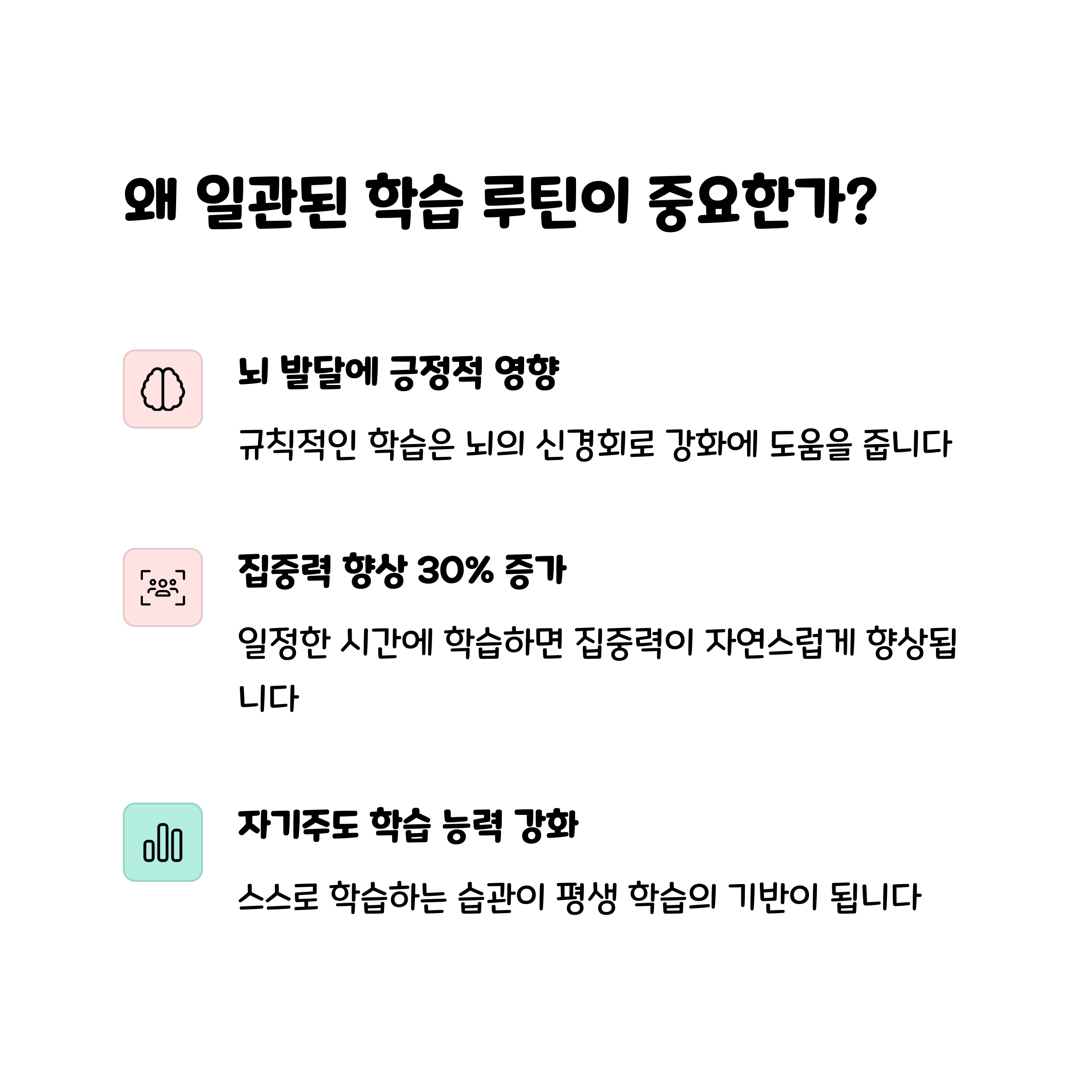 | 정해진 시간과 장소가 루틴 형성에 도움 | 스스로 목표를 세우고 실행하는 힘을 키움 | 준비-집중-정리의 3단계로 구성 |