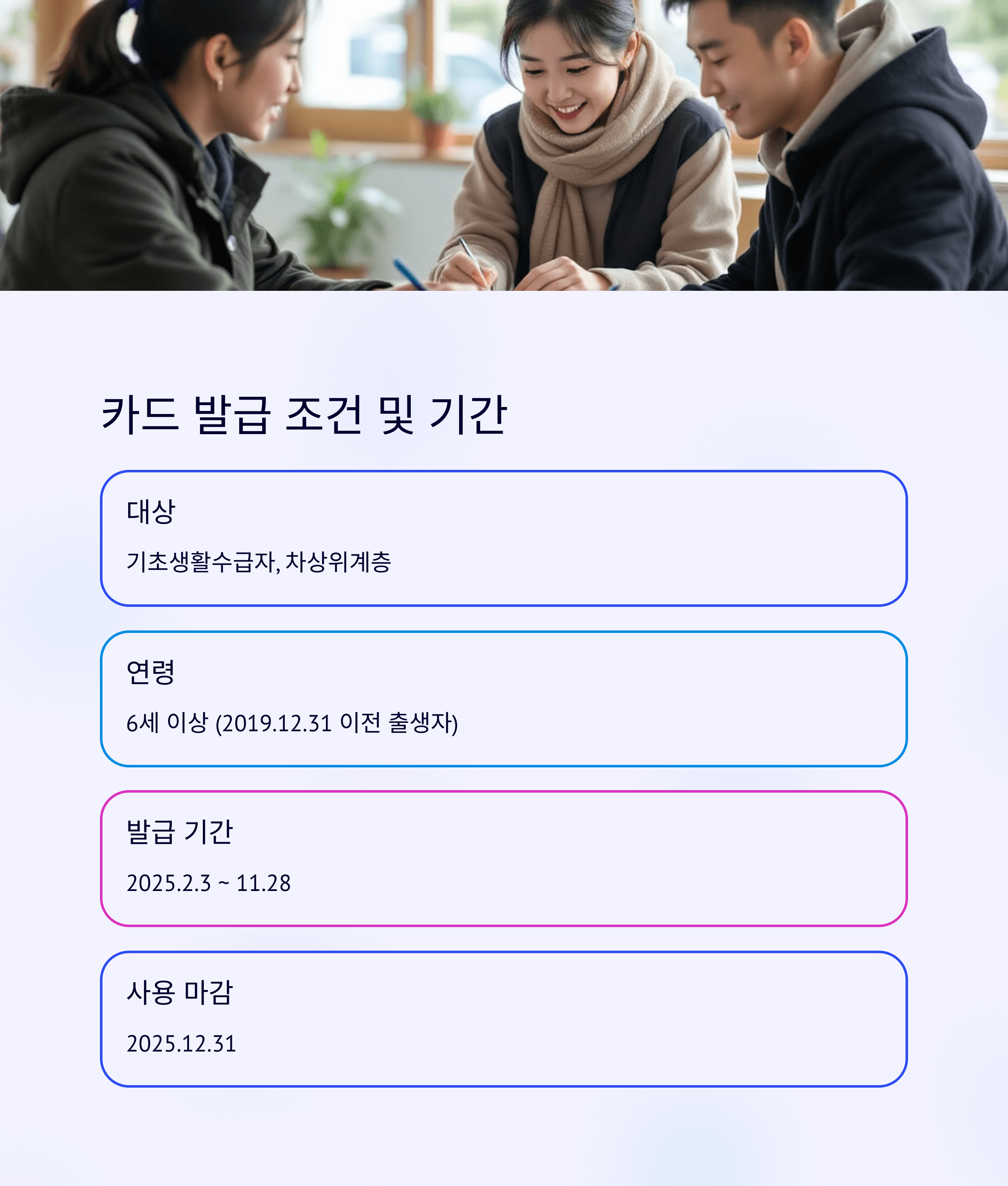 2025년 문화누리카드는 아래 조건을 충족하면 발급받을 수 있습니다